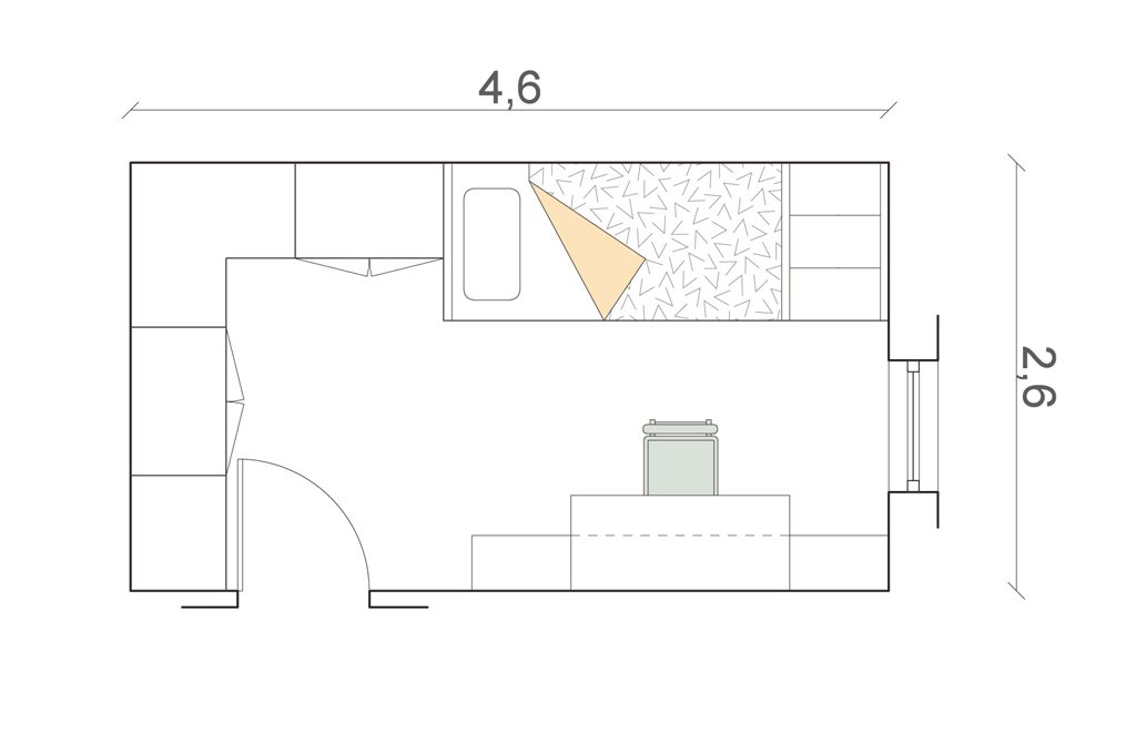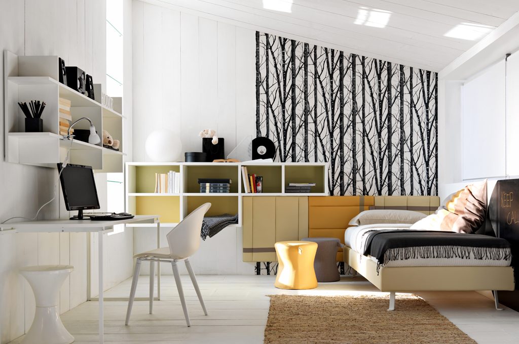 per un figlio (o figlia) non ancora adolescente serve spazio per giocare: è bene lasciare una zona libera a centro stanza. I contenitori a giorno consentono di tenere giochi e libri sotto mano mentre un grande armadio a tutta parete può ospitare anche la biancheria per la casa.