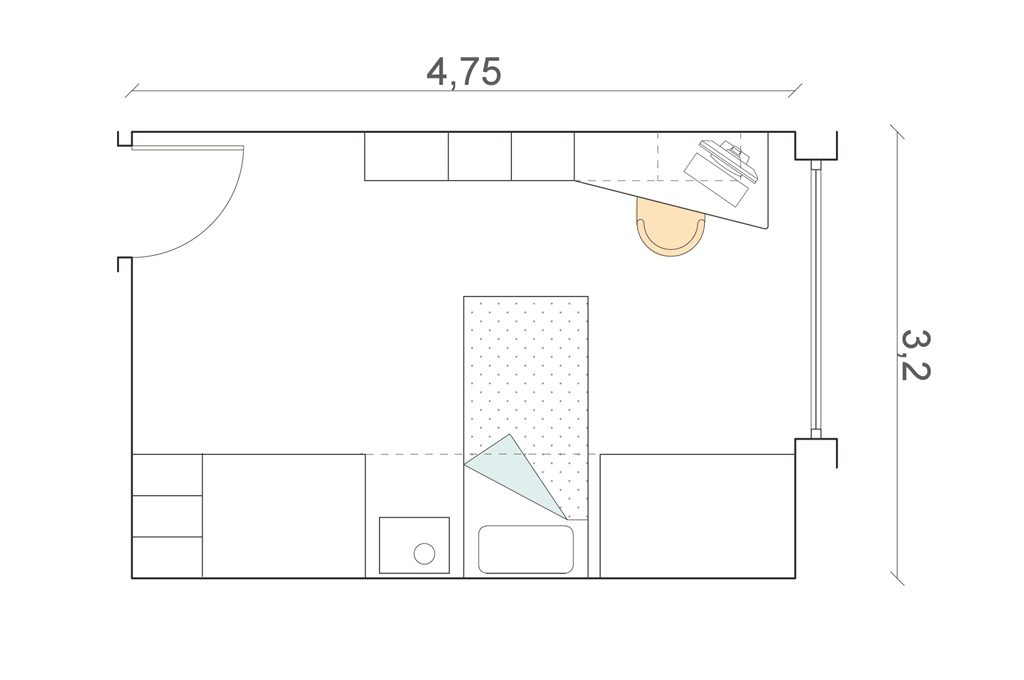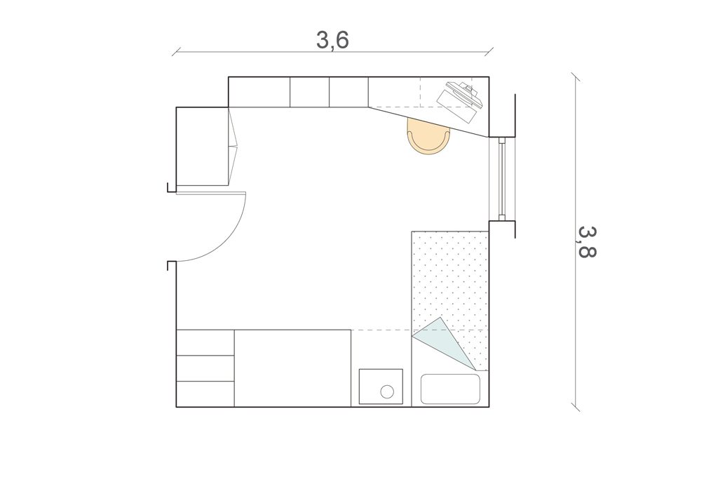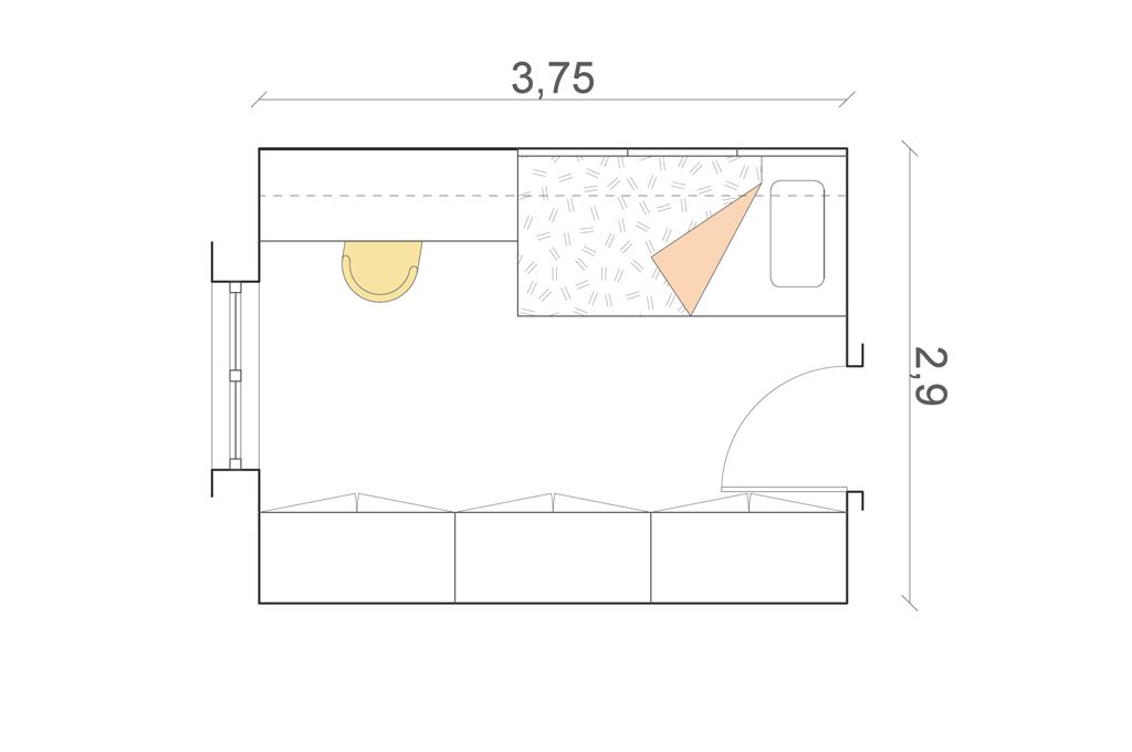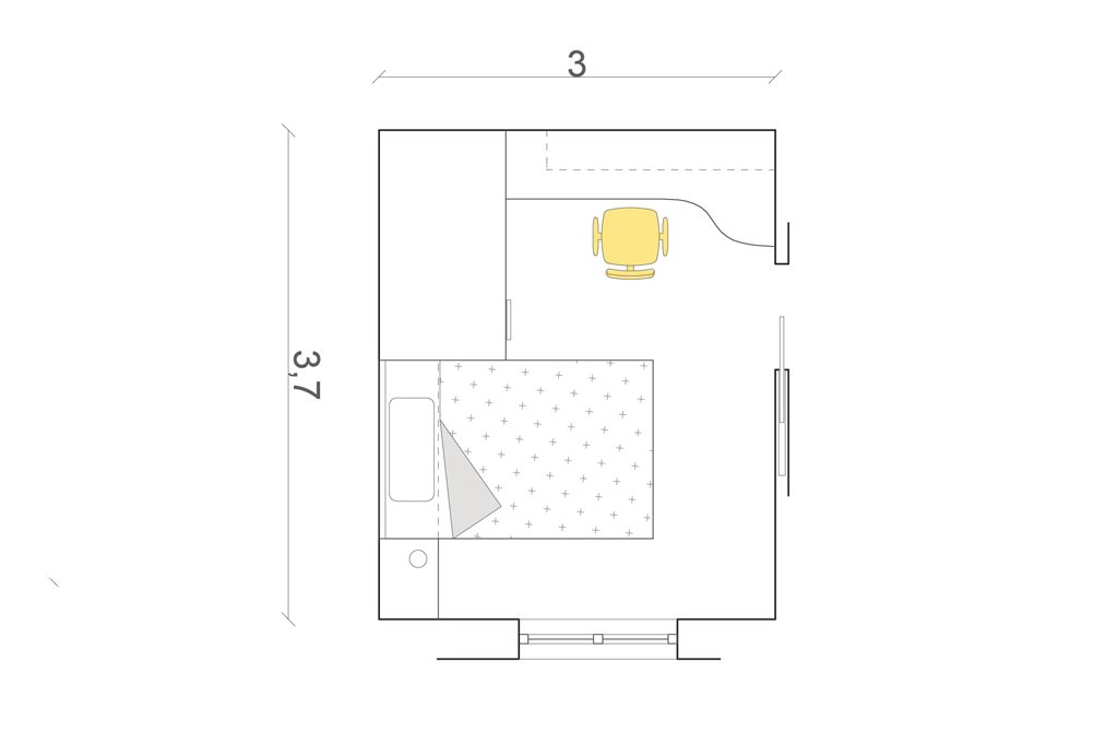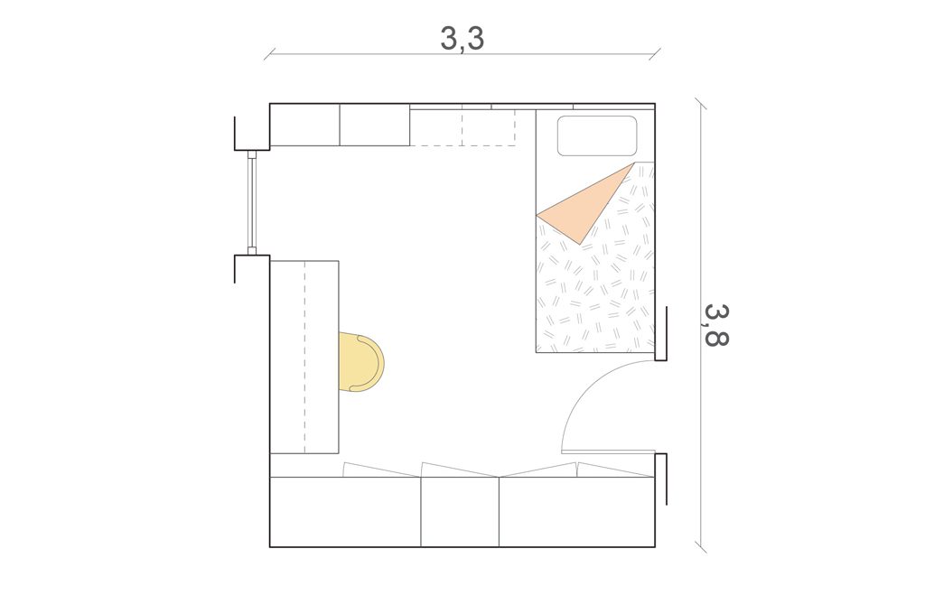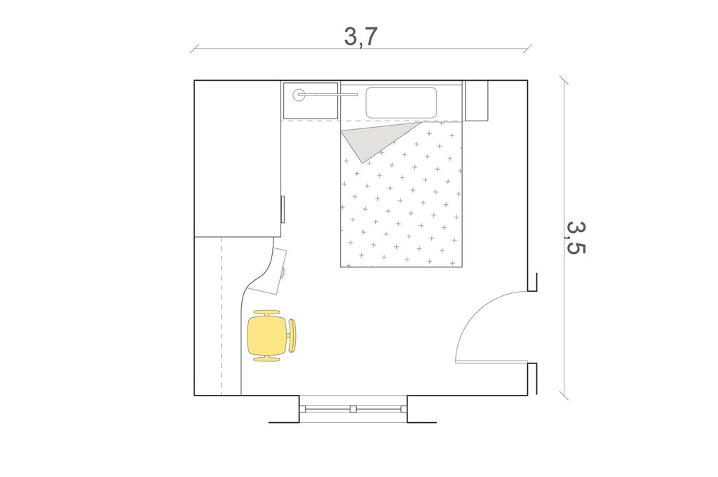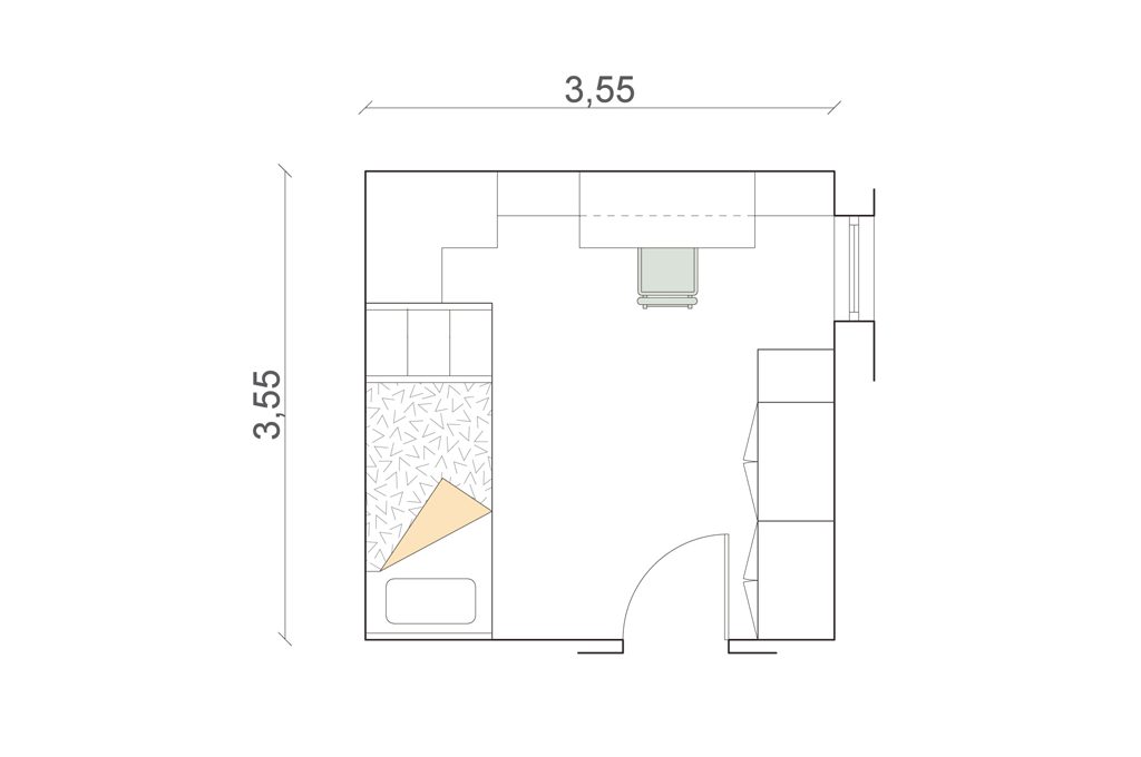 La stanza quadrata (cm 355x355) utilizza il contenitore ad angolo per raccordare i letti con la zona scrittoio. Il resto dell’armadio si trova vicino alla finestra.
