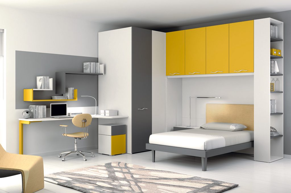Ha la cabina armadio angolare e il guardaroba a ponte (in totale cm 174x326,6x258h) sopra il letto da cm 135x207,5 la camera KP114 completa di scrivania da cm 173x40/96x77h. In frassino bianco e laccato grigio e senape [Moretti Compact €3.952].