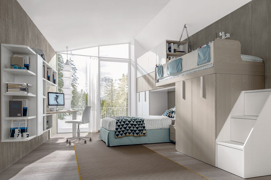 i due figli sono distanti per età? Per loro servono spazi ben distinti, per esempio con un sistema a soppalco. Il grande dormirà nel letto in basso e avrà la zona studio e un armadio a doppia altezza a disposizione. Il piccolo potrà rifugiarsi nel suo letto a soppalco, nascondere i giochi in una pratica scala-contenitore e tenere in ordine i propri vestiti nell’armadio in basso, facilmente accessibile.