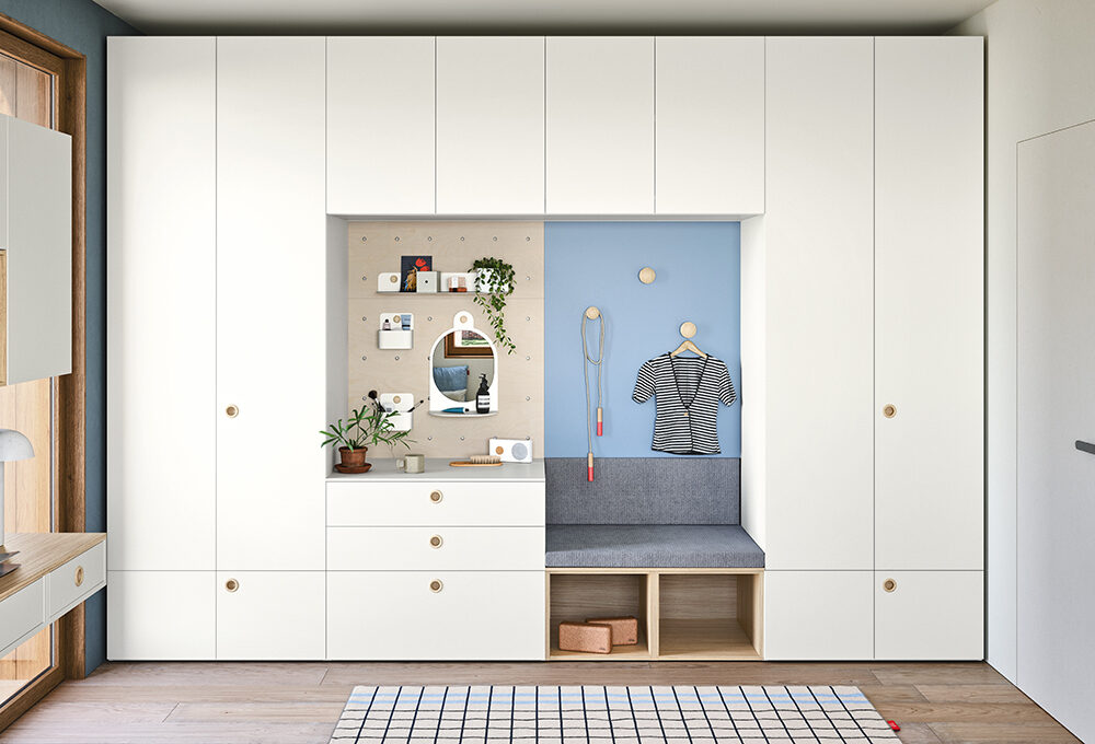 Cameretta KC403 con cabina armadio dal terminale a libreria e moduli pensili Wallbox e