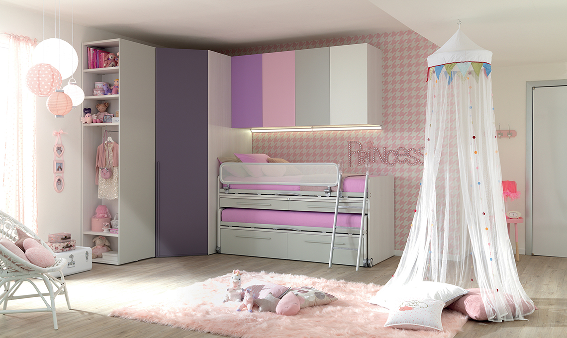 a effetto plissè in finitura Cipria, comodino e pensile a giorno. Scrivania Allan, sedia Maestrale e tavolino Circus [Scandola Mobili].