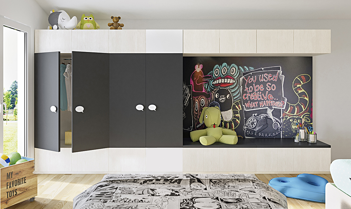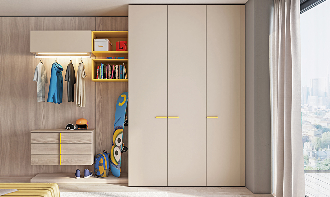 Sì ai vani a giorno integrati, per riporre libri e accessori che a questa età sono tantissimi. L’armadio deve essere modulare e versatile perché le esigenze di spazio crescono rapidamente, così come il suo utilizzo può variare con il passare del tempo. La cabina a giorno è l’angolo ‘take & go’, dove appendere i capi di stagione e riporre al volo zaino, borse, scarpe, casco, skate e attrezzi sportivi.