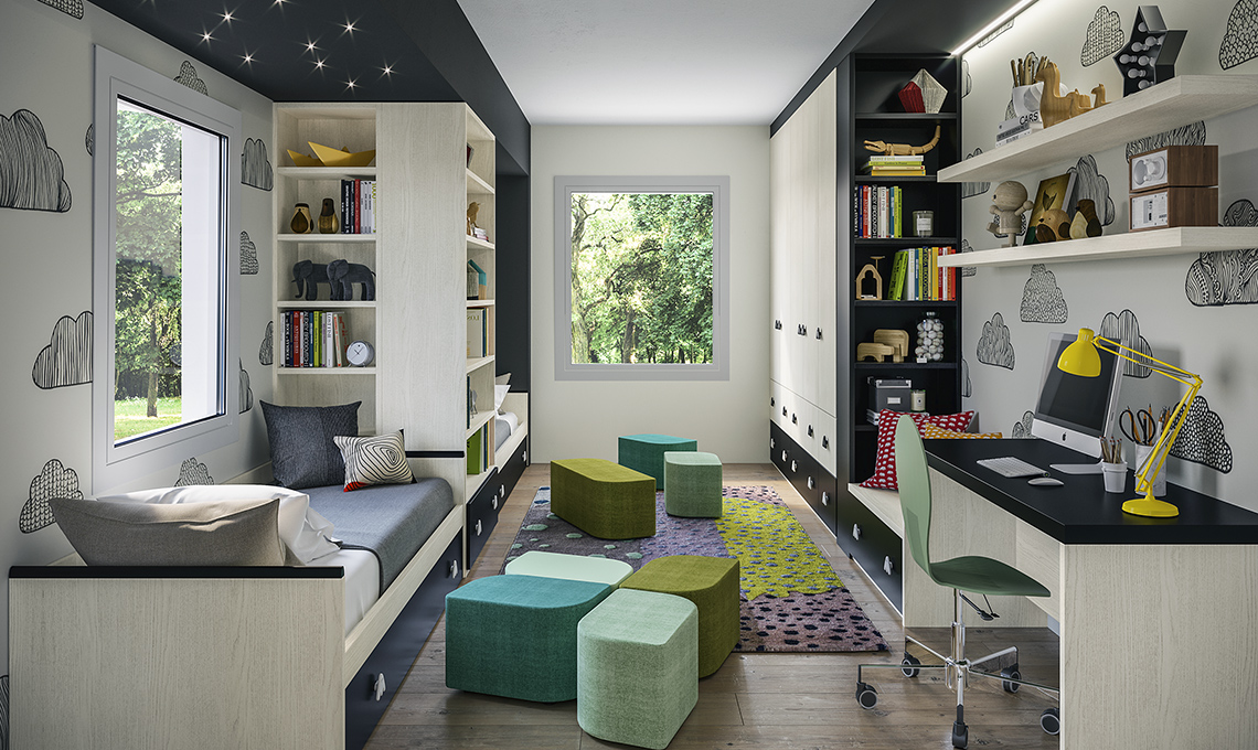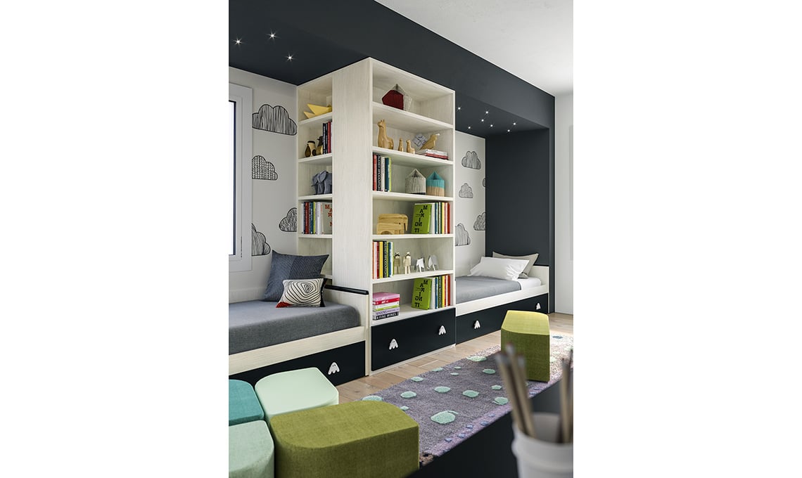Le librerie oltre a contenere libri di scuola e quaderni, possono ospitare oggetti dedicati al relax come radio o diffusori audio, ma anche un piccolo angolo bar con acqua, bibite e bicchieri. In più, sono un ottimo strumento per suddividere la camera in diverse zone per garantire a ogni figlio la giusta privacy.