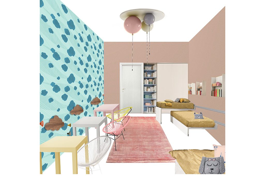 Per il lato opposto ho scelto una carta da parati a nuvolette: qui puoi appoggiare tre tavolini personalizzati con diversi colori, così ogni bambina avrà uno spazio ‘solo suo’».