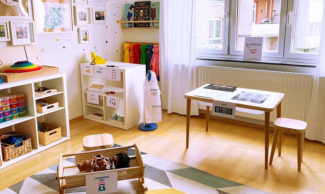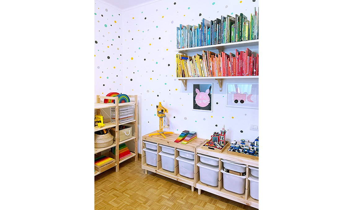 La zona notte, con il lettino basso e le mensole frontali per i libri, fungeva anche da angolo lettura. La parete più lunga serviva per l’esposizione dei giochi con un angolo per il gioco simbolico dove all’occorrenza potevo spostare piccoli scaffali e giochi costruiti da me per ricreare un ristorante, un ufficio postale, un supermercato o uno studio medico… Un solo armadio ad ante scorrevoli molto capiente da usare principalmente per contenere giochi e materiali, oltre che per i vestiti, occupava l’ultima parete insieme a due mobili per storage uniti per ottenere un ripiano su cui giocare. Perfetto per creare minimondi e piccoli set.