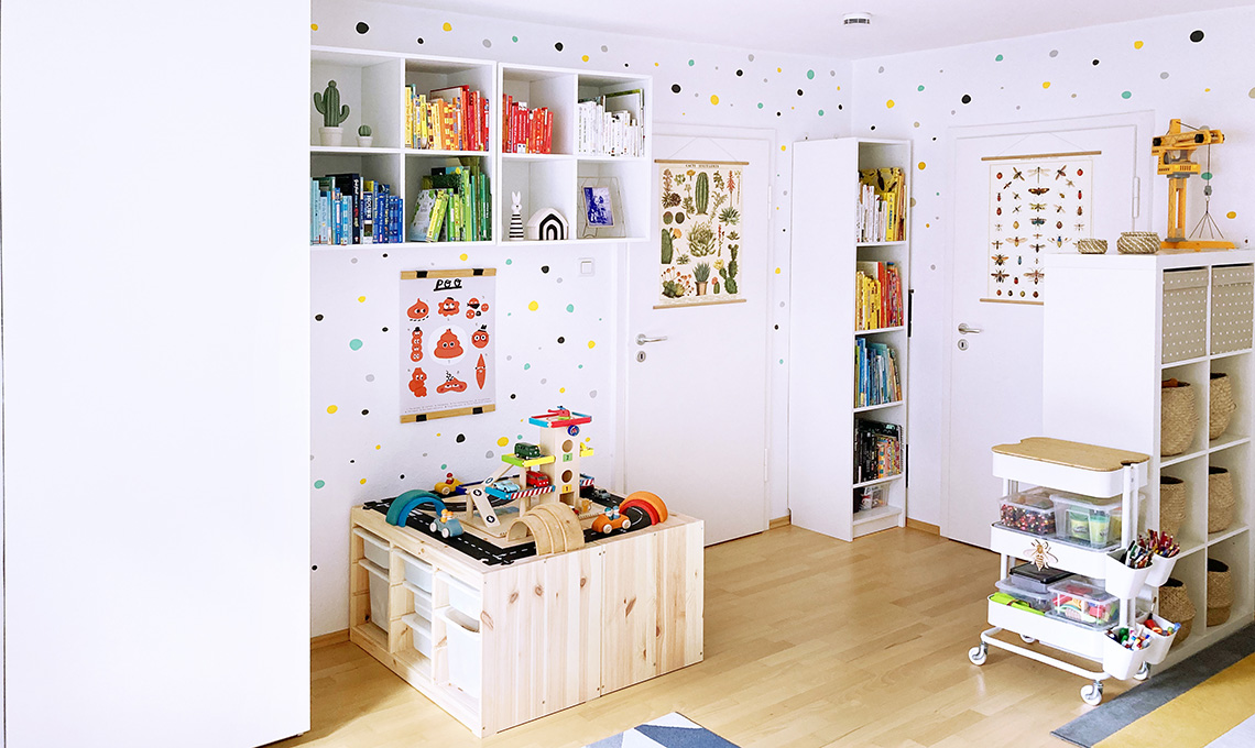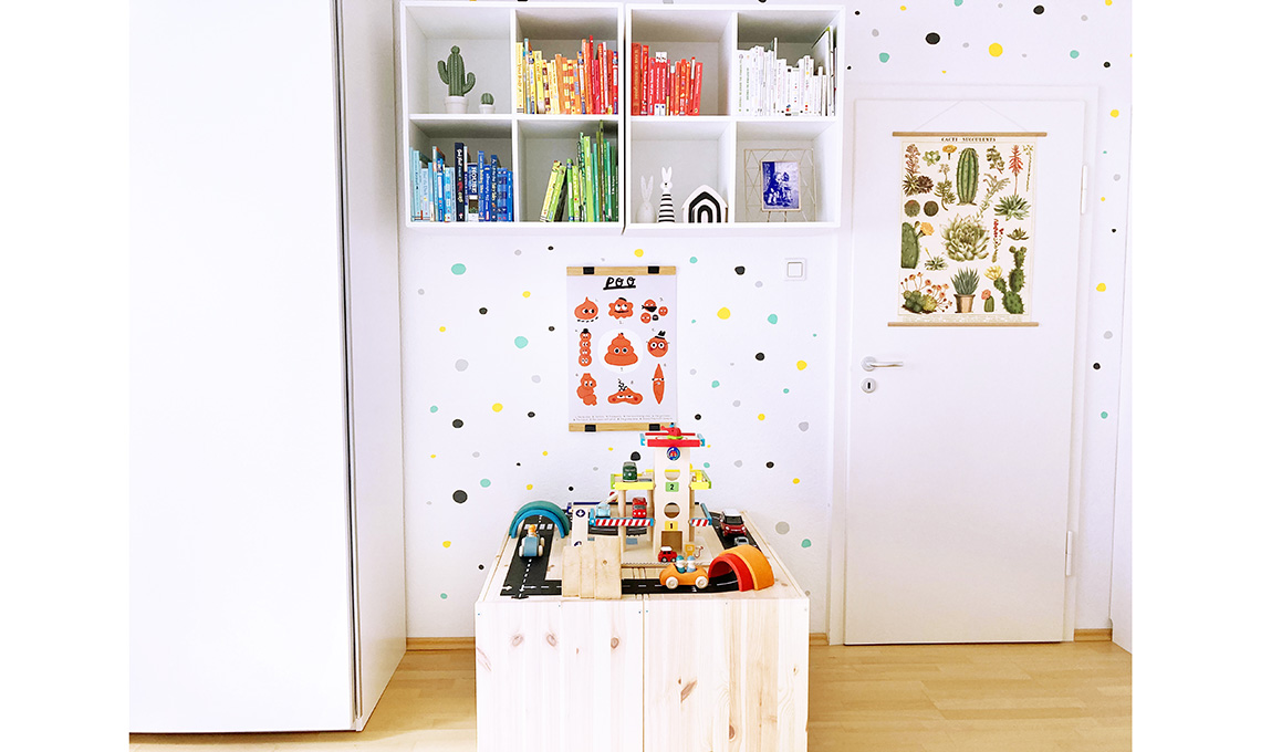 Per l’esposizione dei giochi negli spazi piccoli secondo me la soluzione ideale sono i mobili a scomparti che possono essere usati sia per esporre che per contenere (con ceste o contenitori ad hoc), e quando i bimbi sono un po’ più alti anche come ripiano-gioco. E poi sono facilmente riciclabili in altre zone della casa se si vuole cambiare la disposizione della cameretta nel tempo, super versatili!