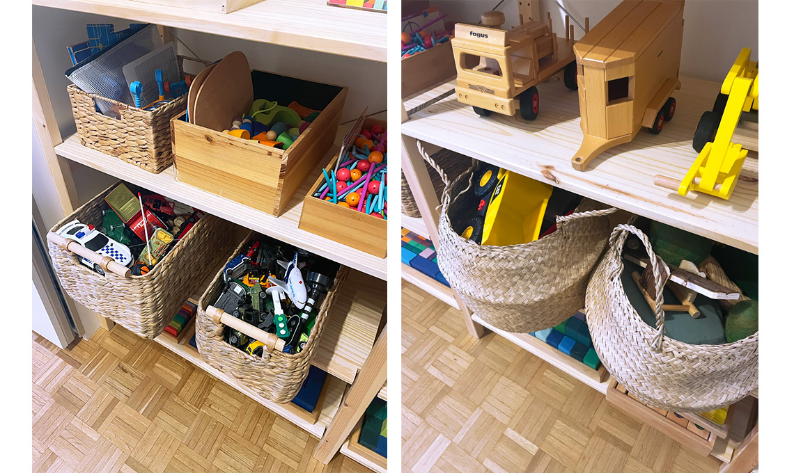 "Per me i contenitori più utili e versatili sono quelli in plastica facilmente impilabili (come per esempio i Trofast di Ikea), sia per contenere giochi (mattoncini, tessere magnetiche, blocchi di legno, piste per trenini, mezzi di trasporto….), sia per materiali sensoriali di ogni tipo (riso colorato, ceci, semini vari, sabbia cinetica…)."
