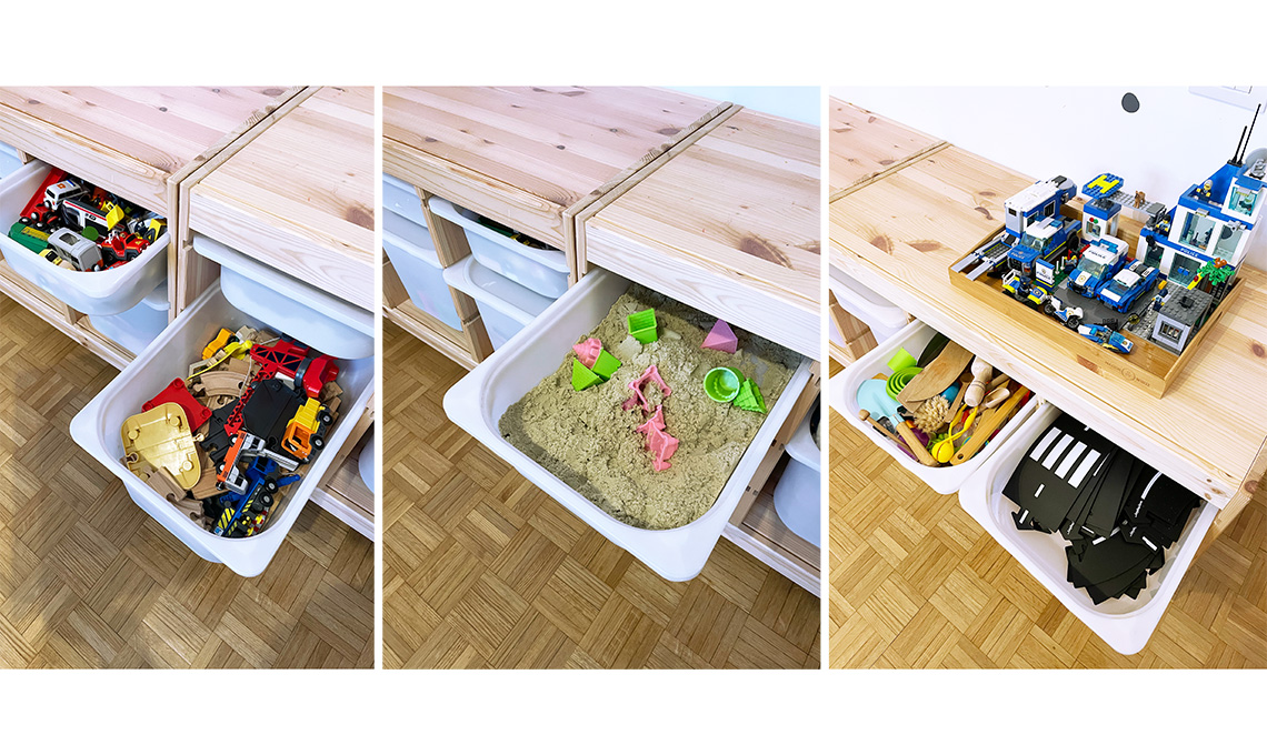 Per me i contenitori più utili e versatili sono quelli in plastica facilmente impilabili (come per esempio i Trofast di Ikea), sia per contenere giochi (mattoncini, tessere magnetiche, blocchi di legno, piste per trenini, mezzi di trasporto….), sia per materiali sensoriali di ogni tipo (riso colorato, ceci, semini vari, sabbia cinetica…).
