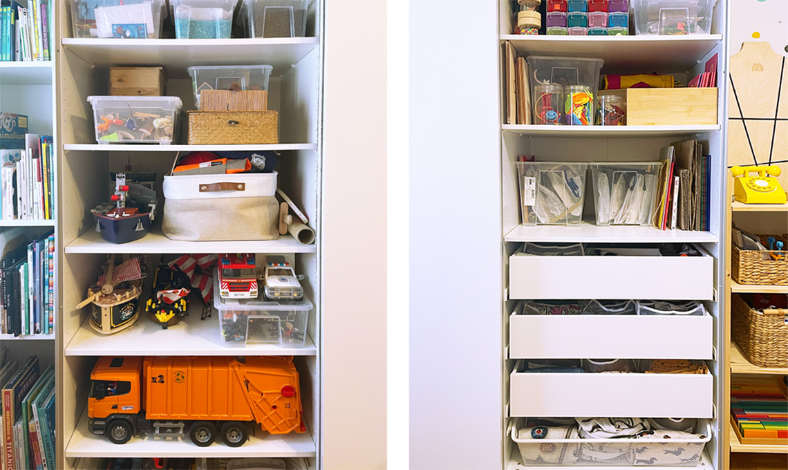 Sicuramente in casa nostra c’è uno sbilanciamento forte verso i giochi e di conseguenza lo spazio destinato ai vestiti è abbastanza ridotto. Ma nella mia esperienza, soprattutto prima dei 3/4 anni, non servono moltissimi vestiti. Anche adesso ammetto che 4 cassetti molto capienti contengono comodamente tutti i vestiti di Zeno, e non sono pochi! Oltretutto i cassetti, se ben organizzati, sono la soluzione migliore per favorire la scelta autonoma dei vestiti.