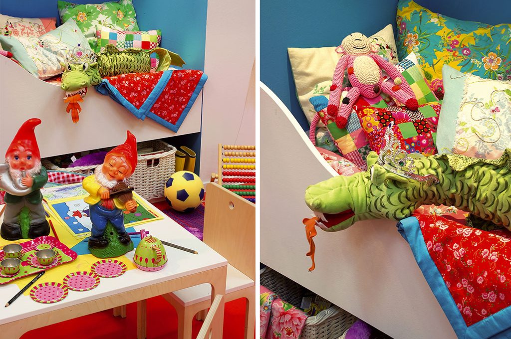 Dipinte le pareti, fissato il letto e le mensole, passa ad attrezzare il tutto con quello che servirà al tuo bambino. Sul materassino, oltre al copriletto metti tanti cuscini, rivestiti con tessuti fantasia multicolor in tonalità squillanti. Sui ripiani troveranno posto i peluches e la luce, da lasciare accesa anche di notte. Sotto la culla raccoglierai i giochi grandi e piccoli all’interno di ceste (le nostre sono in vimini, ma ce ne sono di bellissime anche in tessuto imbottito e in latta). Infine, stendi a terra un tappetino.