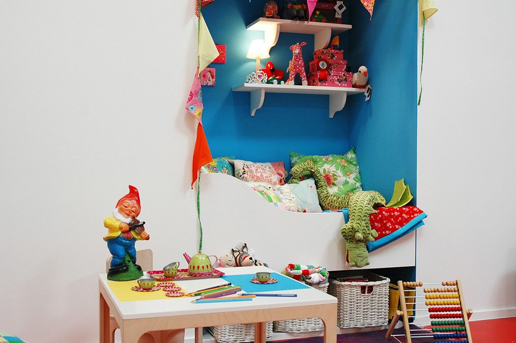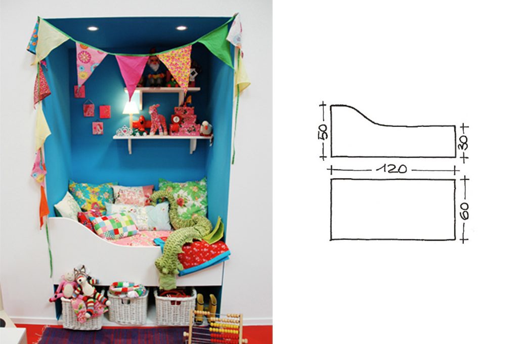 Una nicchia da cm 120x60 è stata attrezzata con un lettino su misura e due mensole per i giochi.