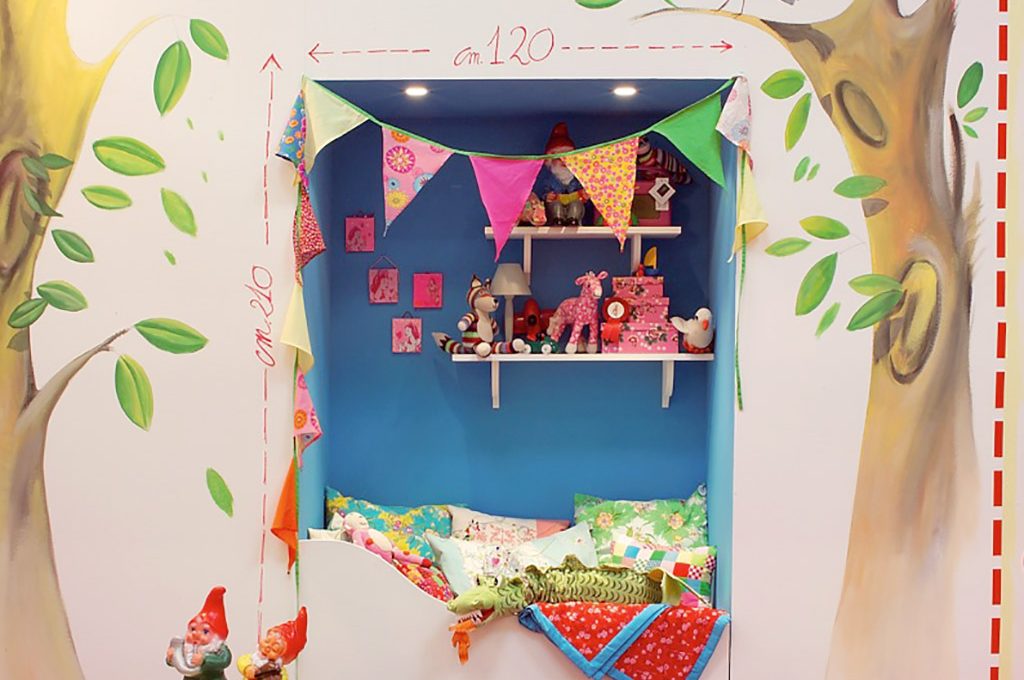 Per personalizzare lo spazio non c’è niente di meglio che creare un decoro che incornici la nicchia. Se sei creativa e hai manualità puoi lanciarti in un trompe-l’oeil da fare da sola, come quello che vedi nella foto qui a sinistra. In alternativa, puoi giocare con gli sticker: ne trovi di ogni forma e colore nei grandi magazzini del fai-da-te oppure nei colorifici. Il lavoro è più semplice e l’effetto assicurato!