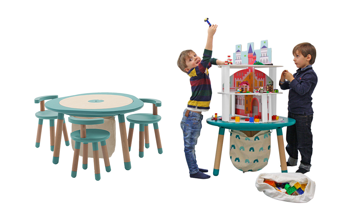 Il tavolo gioco Mutable ha 4 piani double face con lavagne, base Lego compatibile, una pista città, una paesaggio naturale e una puzzle più tanti accessori extra [Mukako, cm 71x45/59h € 199].