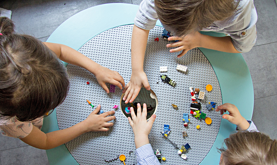 I bimbi crescono?...cresce anche il tavolo: basta sostituire le gambe passando da quelle da cm 55 a quelle da cm 73, tenendo lo stesso top. Lontano dai muri e in posizione centrale, il tavolo invita a sentirsi (più) liberi di muoversi, passando da una postazione all’altra alla ricerca di stimoli nuovi.