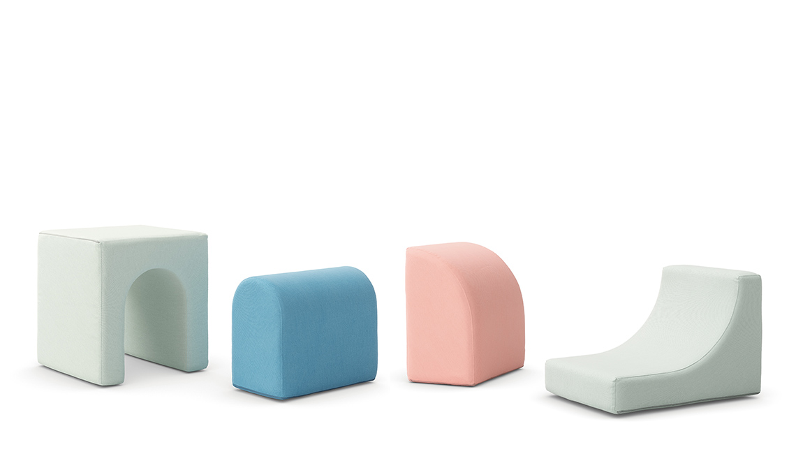 I pouf multifunzione si trasformano in giochi a incastro, scivoli, tunnel segreti e mini-librerie: Iori e Klove si sdoppiano, Noel ha la fessura per libri e fumetti [Nidi prezzo su richiesta].