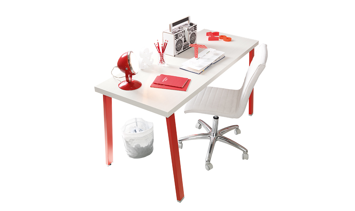 L’altezza della sedia è corretta se il busto del ragazzo seduto è perpendicolare alle cosce, se le ginocchia sono a90°e se i piedi toccano a terra. La poltroncina imbottita e con meccanismo di sollevamento a gas consente di alzare e abbassare la sedia per trovare la postura corretta. A questa età sulla scrivania c’è ‘il mondo’... che va tenuto ordinato, ma lasciato libero di esprimersi.