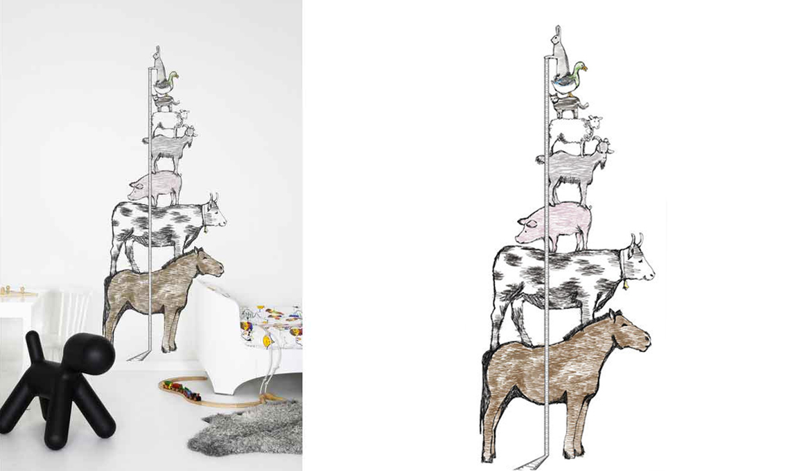 Pannello di carta da parati stampata in digitale in cui compaiono gli animali della favola "I musicanti di Brema". Anche in questo caso la misura generale del pannello può essere personalizzata e adattata al muro della cameretta.