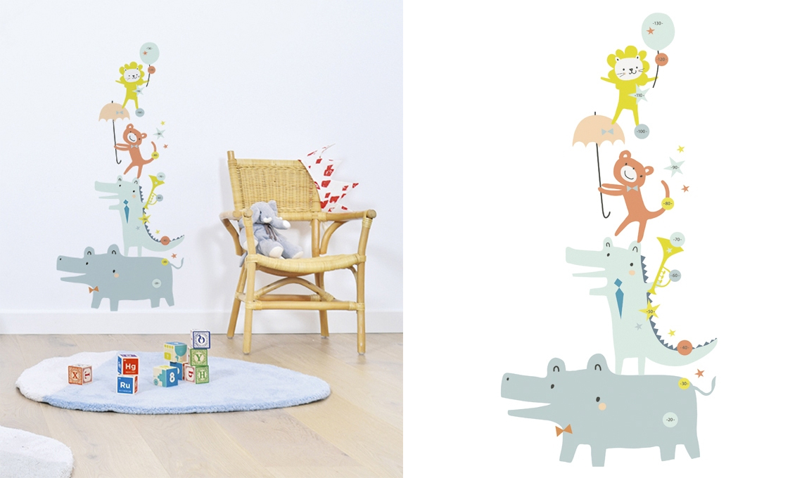 Divertente metro per la crescita dai toni naturali, parte da 70 per arrivare a 160 cm. Ogni dieci centimetri è decorato con un animaletto divertente come la renna del cannone, l'orsetta ballerina e l'orso forzuto.