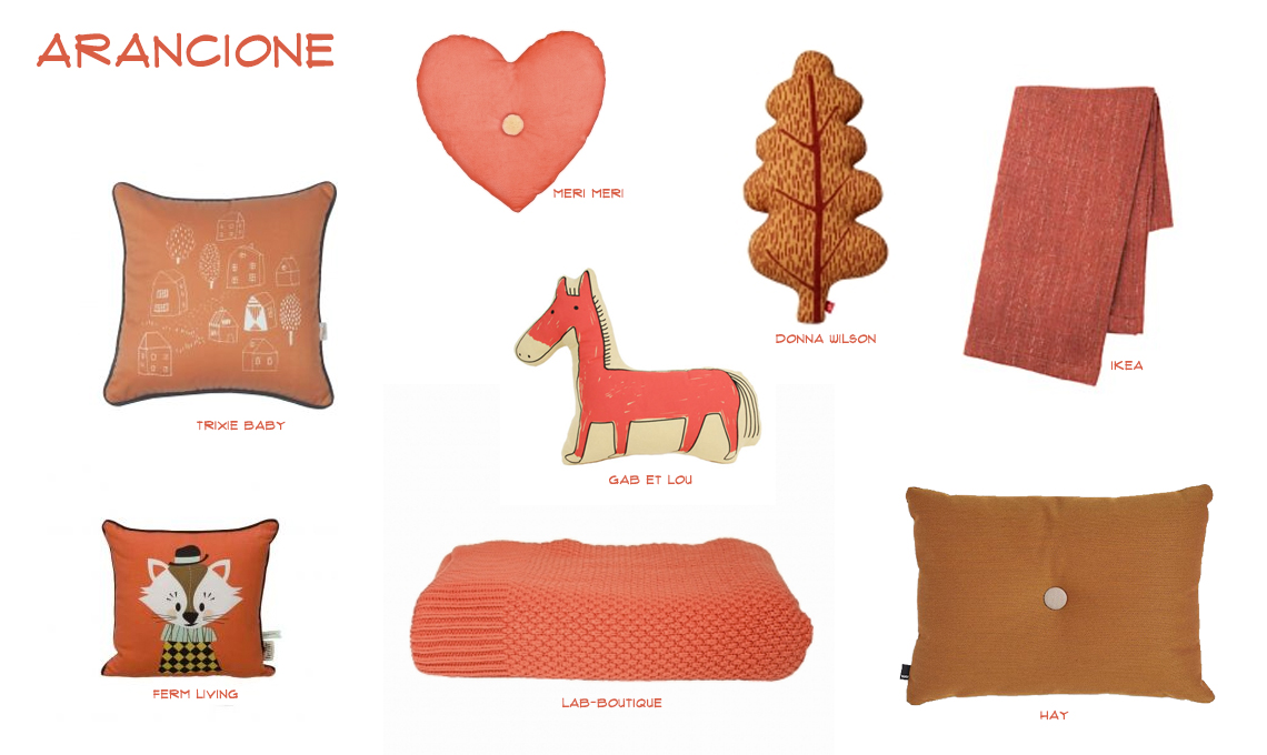Per chi ama complementi dai colori vivaci, l’arancione è uno dei colori ideali. Dona energia e allegri alla cameretta. Potete scegliere tra il plaid Gurli di Ikea (€9,99) e la coperta di lana di Lab-Boutique (€109,00). I cuscini possono essere classici come il modello Dot di Hay con bottone centrale (€79,00), quello con casette stilizzate bianche Little Village di Trixie Baby (€37,00) e il mini cuscino Aristokatt di Ferm Living (€34,00).