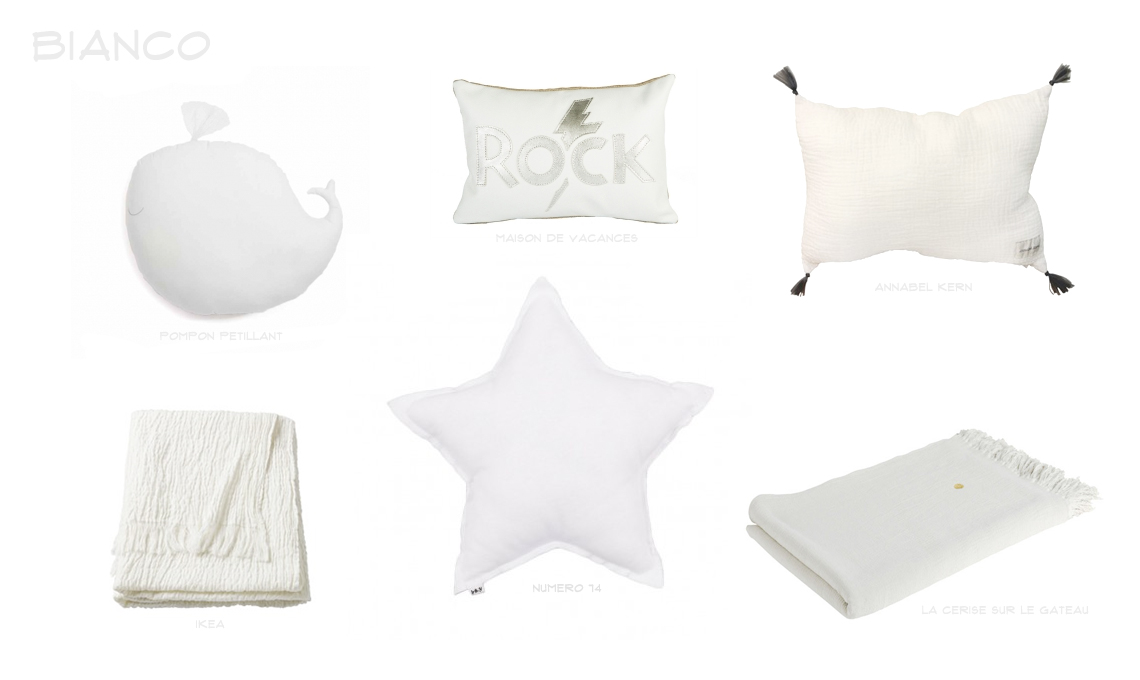 Per gli amanti dell’effetto candido, non resta che puntare sul total white. Abbinate il plaid bianco Mathea di Ikea (€9,99) oppure la coperta in seta di La cerise sur le gâteau (€101,00) con, la balena di Pompon Pétillant (€45,00), il cuscino rock di Maison de Vacances (€99,00), la stella di Numero 74 (€18,00), il cuscino di Annabel Kern (€34,00) e il gioco è fatto.
