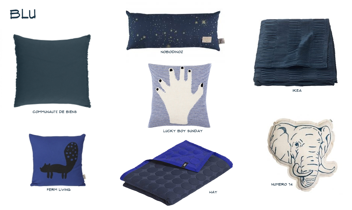 Il brand Nidi ha nella collezione anche molti tessili, tra cui una serie di tre coperte sui toni dell’azzurro (prezzo su richiesta). Quali cuscini abbinare?