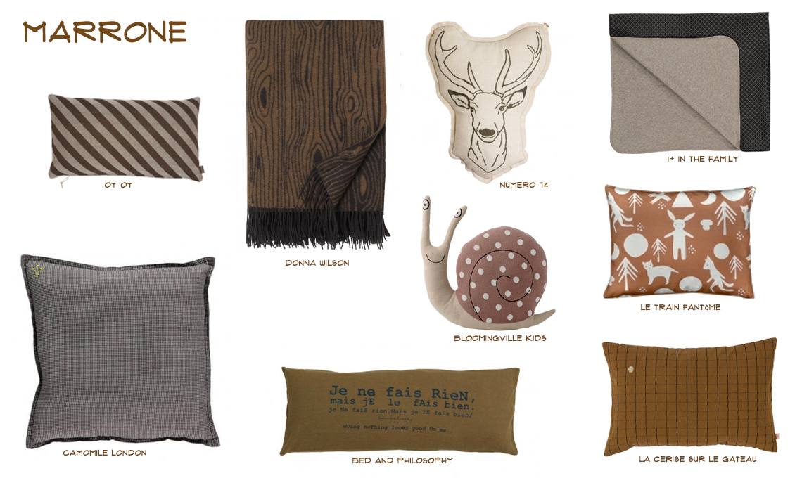 Tradizionalmente considerato un colore adatto alla camera degli adulti o al salotto, anche il marrone trova spazio nella cameretta. Per chi ama la sensazione di calore che trasmette questo colore, può sceglierlo anche per la stanza dei bambini. Davvero divertente la coperta di Donna Wilson che ricorda il tronco di un albero (€225,00), più tradizionale quella double face marrone e beige di 1+ in the family (€29,00). Per completare la cameretta, accostate tanti cuscini classici, come il modello a righe oblique di OY OY (€55,00), il cuscino con scritte di Bed and Philosophy (€60,00), il modello a quadretti di Camomile London (€29,00) e quello di senape di La cerise sur le gâteau (€40,00) a cuscini dalle forme e fantasie insolite.