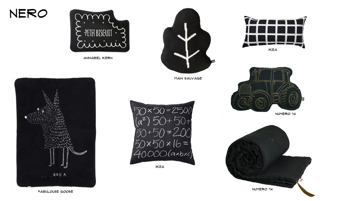 Di grande tendenza nelle camerette in stile nordico, il nero non è più un tabù nelle camere dei bambini. Se non volete rischiare scegliendo mobili scuri, potete optare per coperte e cuscini. Divertente la coperta double face con lupo di Fabulous goose (€100,00) che è completamente speculare (il lato nero ha la scritta al contrario). La coperta trapuntata di Numero 74 è utile anche come materassino per leggere (€53,00). Tante anche le proposte di cuscini come il biscotto di Annabel Kern (€35,00), la foglia di Main Sauvage (€45,00) e il trattore di Numero 74 (€34,00). Più tradizionali, i cuscini Avsiktlig e Fuffla di Ikea (€4,99 e €9,99).