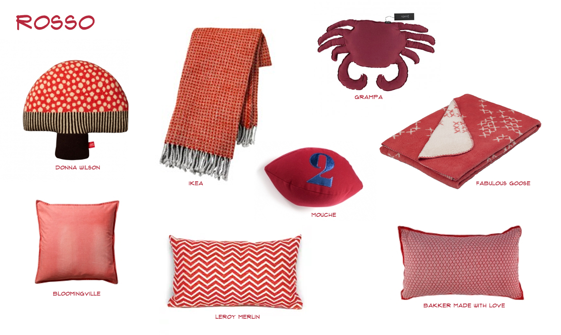 Ambientazione nel bosco per il cuscino a forma di fungo, in lana, di Donna Wilson (€77,00) da abbinare alla coperta rossa con frange Vassad di Ikea (€39,99). Sempre sui toni del rosso, il plaid rosso e bianco che ricorda il punto croce. Si tratta del modello Crossing Flamingo di Fabulous goose (€125,00). Qualche idea di cuscini da abbinare? Perfetto il cuscino con motivo a zig zag di Leroy Merlin (€16,99), Il cuscino rosso di Bloomingville (€46,00) e quello in fantasia di Bakker made with love (€26,00). Non possono mancare due cuscini davvero originali. Un granchio rosso di Grampa (€66,00) e il modello che ricorda una palla da rugby di Mouche (€56,00).