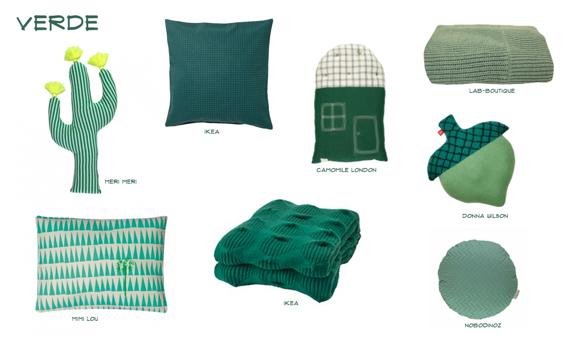 Per chi vuole una cameretta dai colori vivaci ma rilassanti, il verde è assolutamente il colore da scegliere. Sulle coperte di Lab-boutique (€109,00) e Ikea PS 2017 di Ikea (€29,99) potete creare un piccolo paesaggio monocromatico. Sistemate due cuscini dalle forme tradizionali, il modello Ypperlig di Ikea (€4,99) e Brodé Palmier di Mimi’Lou (€39,00) e il cuscino tondo trapuntato verde scuro di Nobodinoz (€38,00). Per completare il tutto, tre cuscini originali e divertenti. Cactus di Meri Meri (€48,00), Casetta a quadri Ikat di Camomile London (€45,00) e il modello a forma di ghianda di Donna Wilson (€81,00).