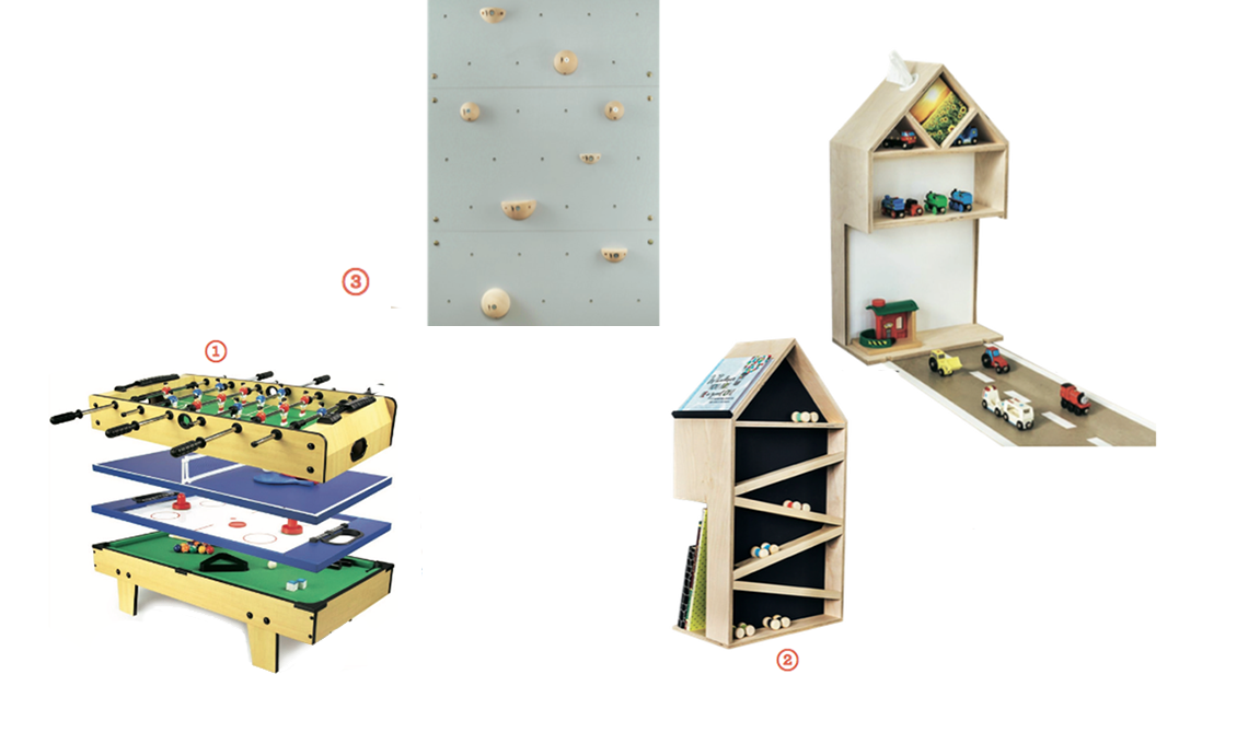 1 Il tavolo da gioco 4 in 1 comprende calciobalilla, biliardo, ping pong e hockey [Leomark, cm 82x43,5x20h € 169,99]. 2 Appeso al muro, Parcours è minilibreria, contenitore per fazzoletti di carta e pista per le 4 macchinine in dotazione. A terra, diventa garage o casa delle bambole [Casie Living, cm 39x21x71h € 299]. 3 Mini parete Climbing Wall, per arrampicate indoor [Nuki, cm 60x100h da € 129].