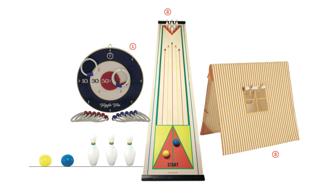 1 Toggle Toss è il classico gioco del lancio degli anelli in versione murale: occupa meno spazio [Brain Blox, cm ø 35 da € 34,40]. 2 Set minipista da bowling per scrivania Table Top Bowling Game, dotato di tappetino avvolgibile, 2 palle e 6 birilli [Kikkerland € 15]. 3 Tenda pieghevole e trasportabile Mustard Thin Striped, realizzata con cotone organico [Ferm Living, cm 100x100h € 125].