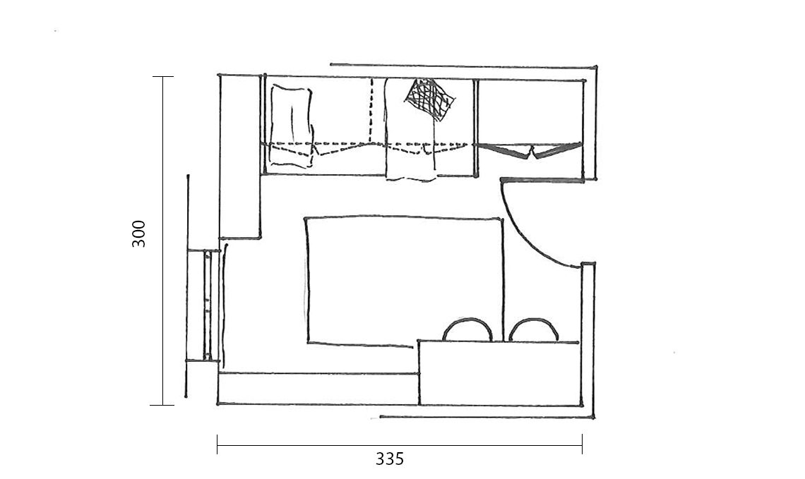 La stanza è quadrata, di circa 10 mq, per ospitare un amichetto per la notte è stato proposto un letto con seconda rete estraibile (così si ottiene un secondo letto vero e proprio); per avere contenitori a sufficienza per vestiti e accessori sportivi l'armadio si sviluppa con un modulo a doppia altezza più due elementi a ponte proprio sopra il letto. Inoltre, per libri e giochi c'è una grande libreria inserita perpendicolarmente all'armadio, che serve anche da comodino/testata del letto. Sul lato opposto della stanza ci stanno, lungo la parete maggiore, mensole e scrittoio da cm 150, così, al centro c’è tanto spazio per il gioco.