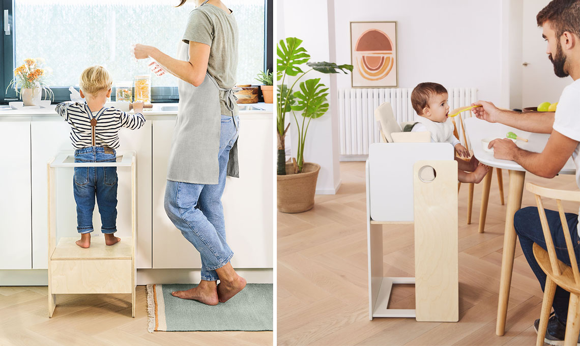 Il metodo Montessori prevede arredi e accessori che possano aiutare i bambini a sperimentare, a imparare attraverso il gioco e a essere indipendenti. Per questo la collezione è caratterizzata da arredi evolutivi, che si trasformano e accompagnano i bambini nella crescita come il seggiolone Nuun composto da una torre di apprendimento e una sedia evolutiva che si possono utilizzare insieme o separatamente.