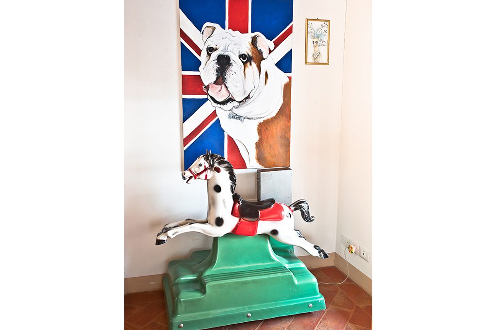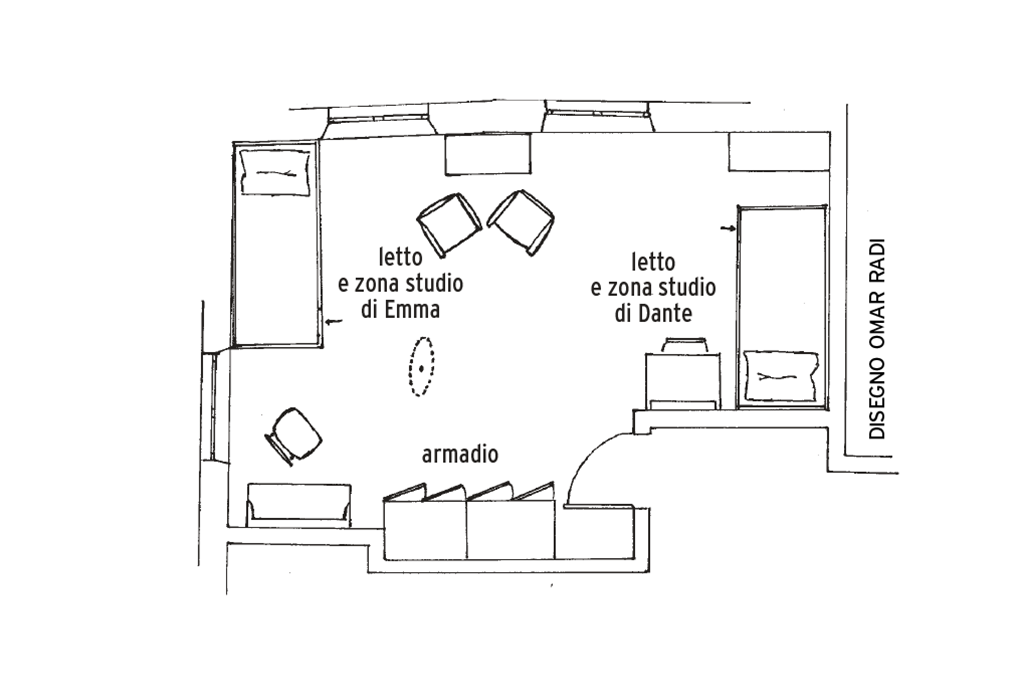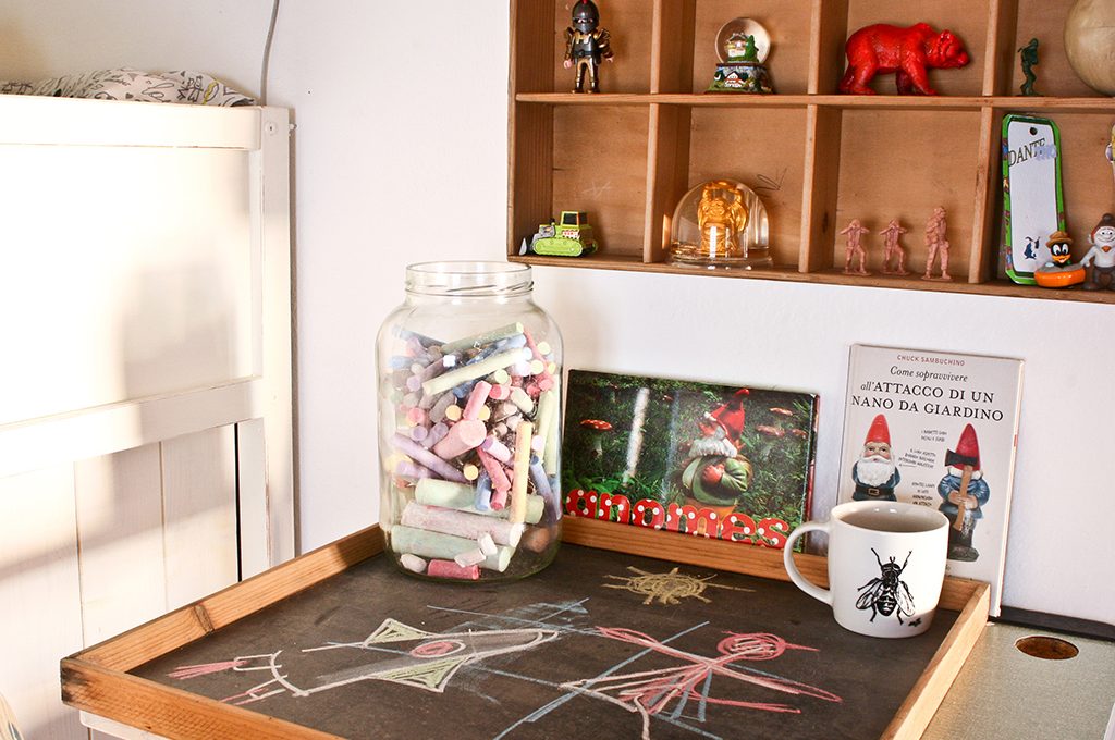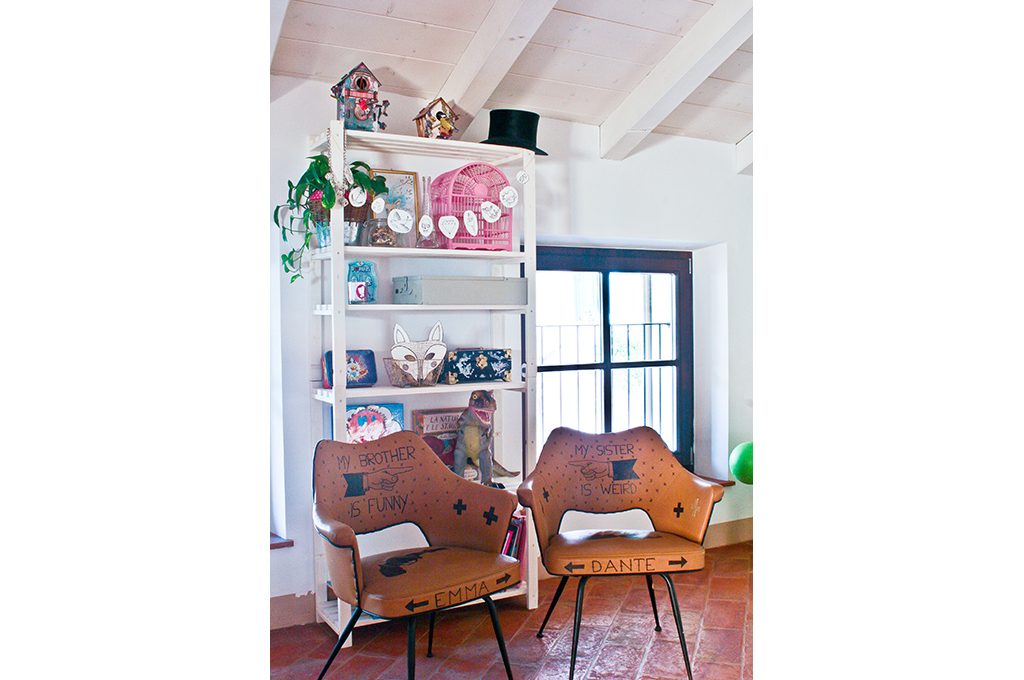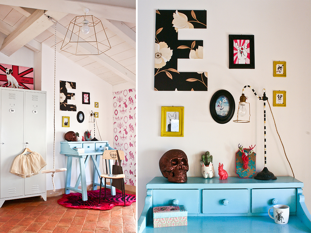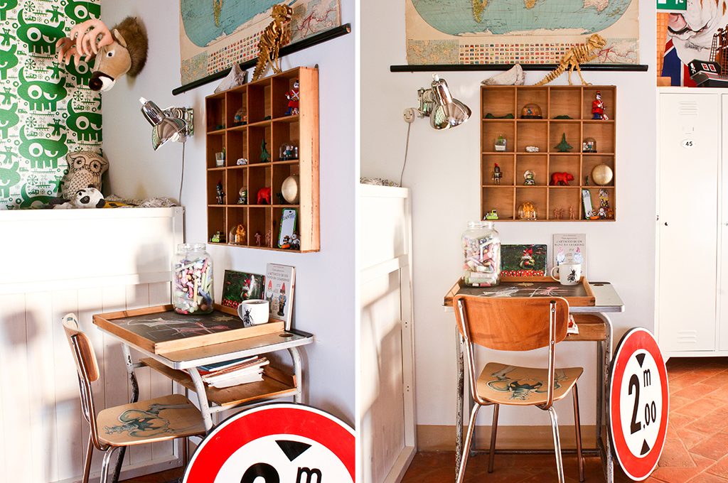 Gli arredi si raddoppiano, ma sono (quasi) tutti uguali: i letti, le librerie, le poltrone! Mia ama il vintage, quello autentico, trovato a pochi euro anche su eBay. Arrivano da lì la sedia, il banco scuola e la cartina rétro.