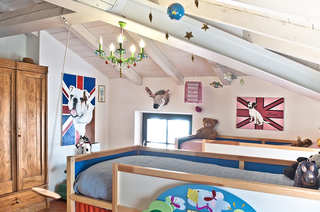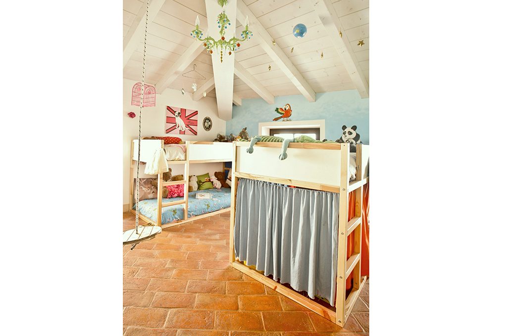 La camera era bella ma ‘da piccoli’ e aveva poco spazio storage: lo si è ricavato schermando la base dei letti Kura [Ikea €134,90] con perline di legno grezzo sbiancato avvitate alla struttura, dipinta di bianco. Per la porticina, un ‘telaio’ di stecche. I due letti poi sono stati sistemati alle due pareti opposte, per avere più spazio per gioco e studio.