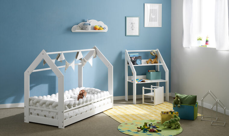 Il modello Turin è perfetto per chi divide la cameretta con un fratello o sorella piccola. Il letto inferiore rispetta le altezze montessoriane e può essere usato anche da bimbi piccolissimi. Per i bambini in età scolare è presete una piccola scrivania incorporata a ribalta che può essere sollevata quando non serve per far posto all’area gioco.