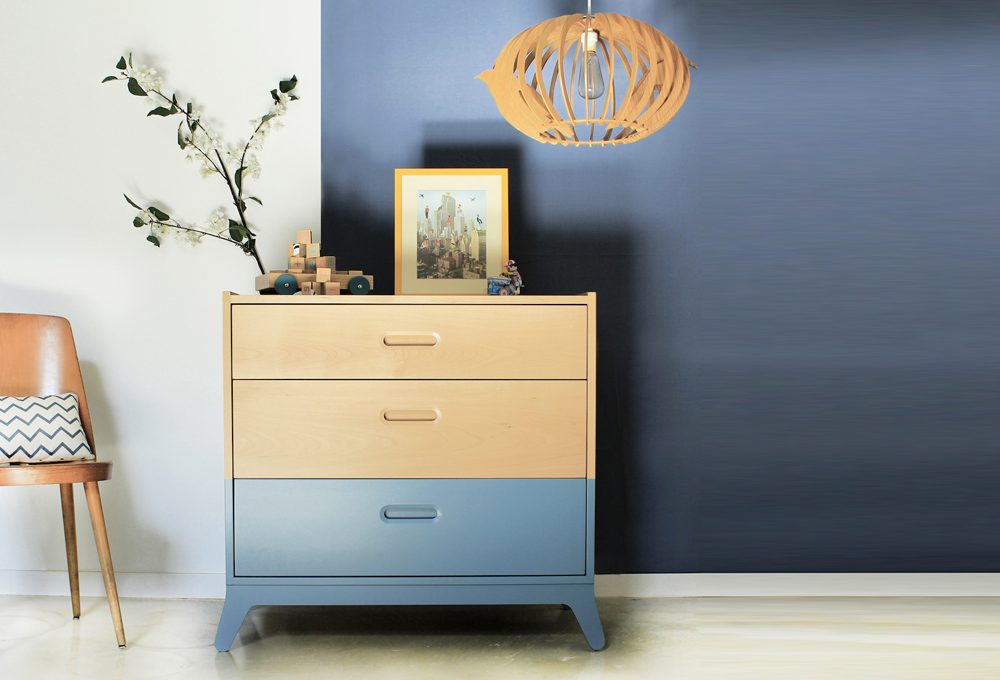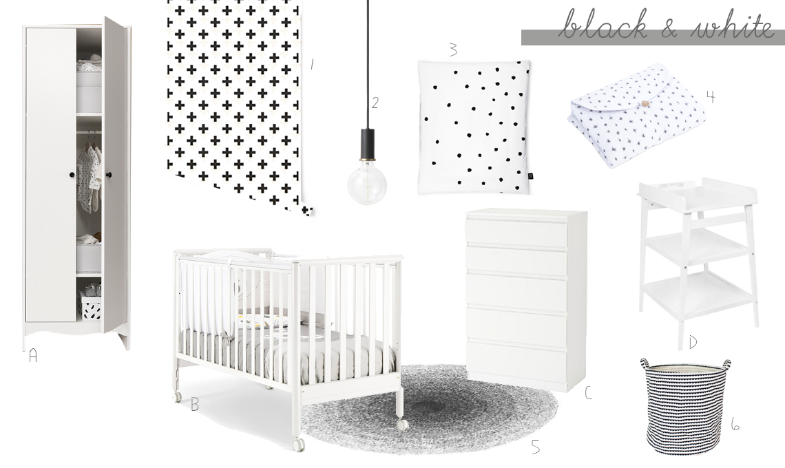 Se ami lo stile nordico, i contrasti bianco e nero saranno un'idea originale adatta anche alla camera del neonato. Cosa serve per ricrearlo? [1] pellicola autoadesiva in PVC di Decochic (37,50€ al rotolo), [2] lampada sospesa dalle linee essenziali Collect Nero di Ferm Living (86€), [3] completo letto Ladybird di Ooh Noo (60€), [4] materassino per fasciatoio di Moumout (40€), [5] tappeto all'uncinetto di Sebra (120€) e [6] cesto porta biancheria o pupazzi di Decochic (25€).
