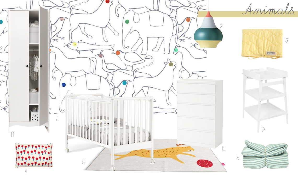 Il tema animali è sempre di moda, rendilo originale ed elegante con gli accessori giusti. [1] carta da parati Animali di Bien Fait (300€ il pannello 182x280 cm), [2] lampada sospesa Cirque di Louis Poulsen (250€), [3] materassino in cotone giallo per il fasciatoio di Nobodinoz (25€), [4] cuscino Pommier di Mimi'Lou (32€), [5] tappeto Felix di Nidi (270€) e [6] tessile letto di Lab (59€).