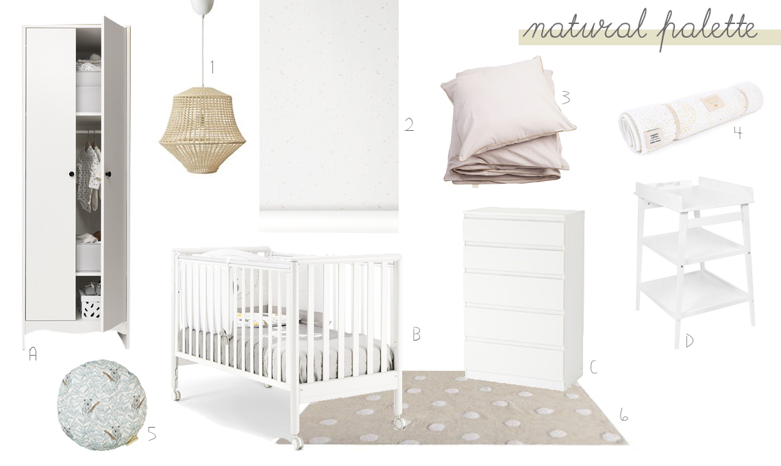 Per una cameretta nei toni naturali, scegli accessori beige, lampade in rattan e decorazioni in nuance. [1] lampada a sospensione Industriell di Ikea (29,99€), [2] carta da parati con stelle di Nobodinoz (56€ al rotolo), [3] tessile letto Dreamy di Fabelab (40€), [4] materassino in cotone per fasciatoio Nomad Bubble di Nobodinoz (19€), [5] cuscino rotondo Koala di Blossom Paris (34€) e [6] tappeto lavabile a pois di Lorena Canals (139€).