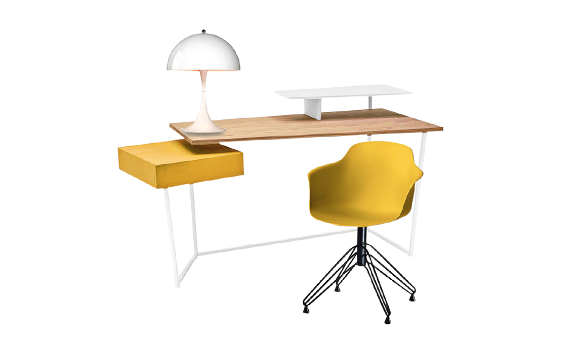 lampada Panthella Mini [Louis Poulsen, ø cm25x33,5h €390]; sedia girevole Mood [Bontempi