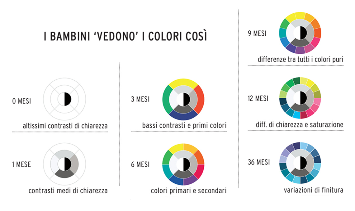La percezione del colore si affina con l’età. I neonati colgono solo differenze di chiarezza, dopo i 3 mesi cominciano a distinguere le nuances e dopo l’anno colgono le differenze di saturazione (vedi schema nella gallery). Prima di scegliere con quale colore dipingere la cameretta, crea lo schema cromatico in base alle dimensioni della stanza e agli arredi.