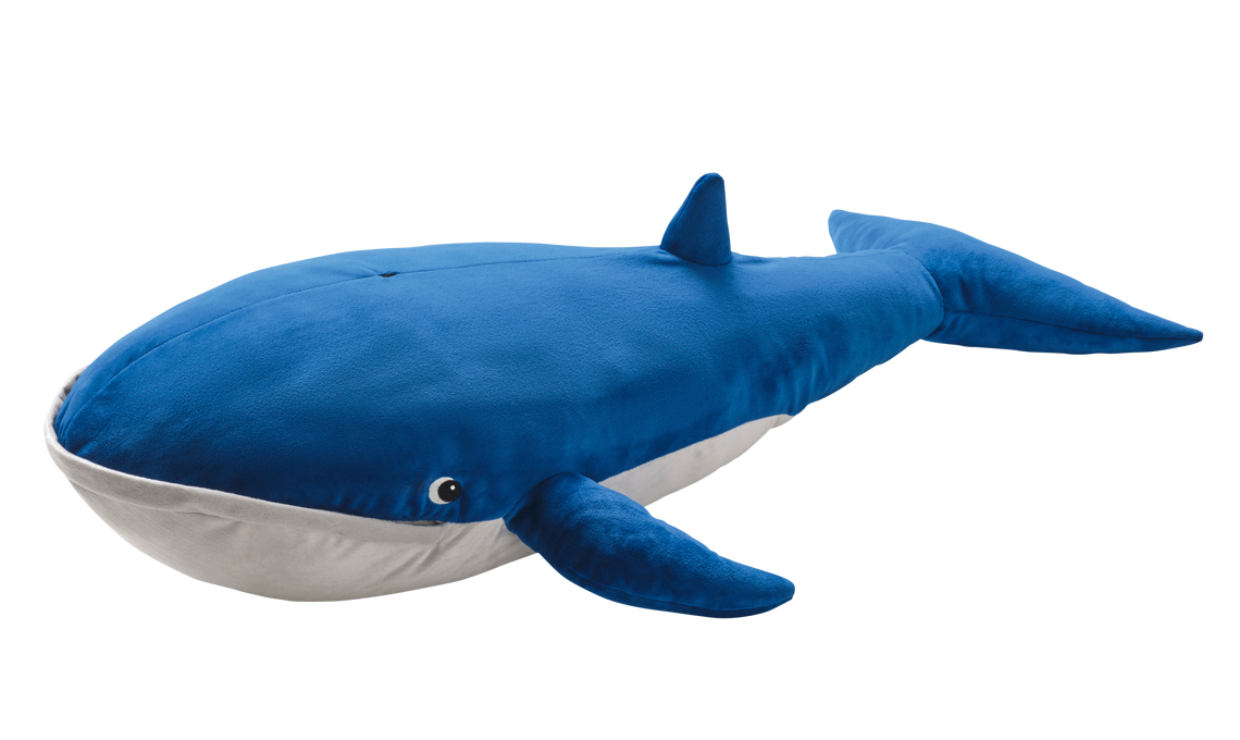 Peluche Balena Blu della collezione Blåvingad, in 100% poliestere riciclato. L’imbottitura è ricavata dalla plastica dispersa nell’ambiente fino a 50 km dalle coste [Ikea]