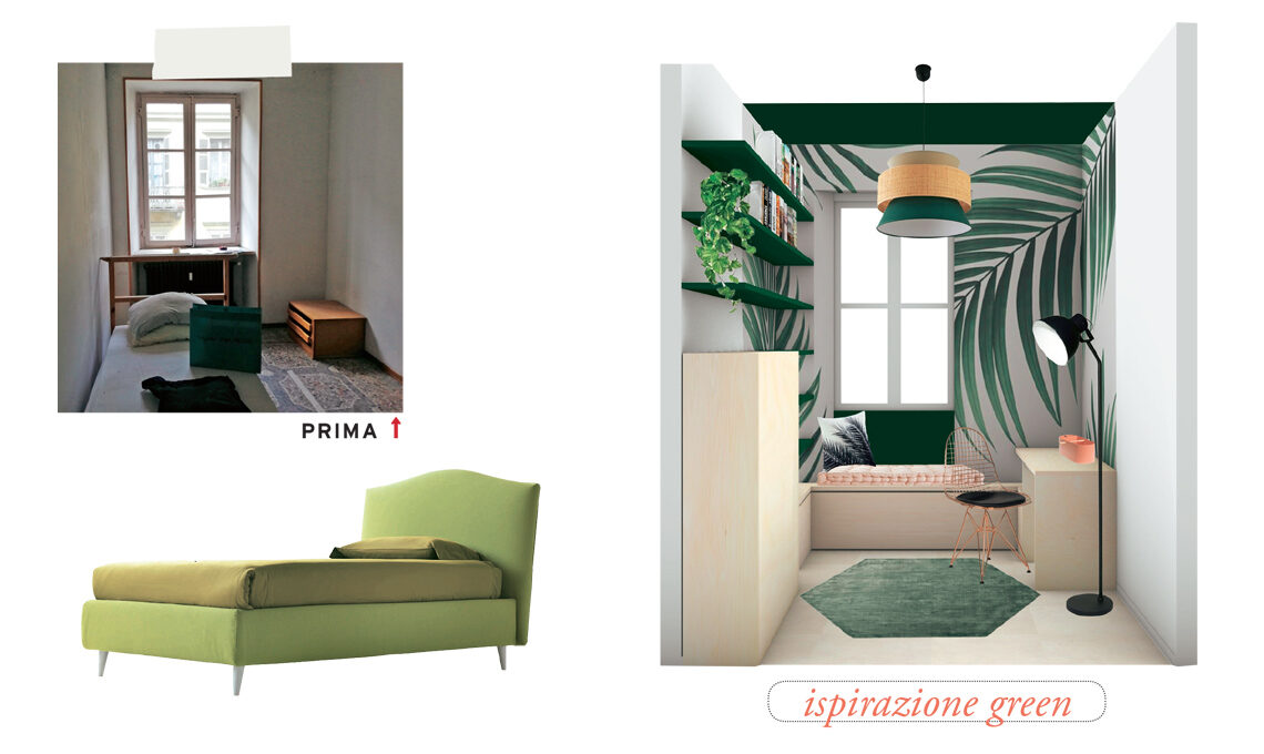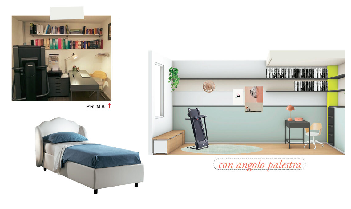 La stanza è riorganizzata sulla lunghezza di 5,5 metri. La zona studio è arricchita da contenitori, l’area fitness ha tapis roulant e panca con cestoni. Le fasce di colore, verde Tranquil Dawn [Sikkens] e rosa Setting Plaster [Farrow&Ball] danno carattere. Luce da tavolo Flowerpot [&tradition], applique Phinx [Westwing], tappeto prima Nova [Benuta]. l letto è Nuvola, dalla testata avvolgente e sagomata, più box sottorete [PerDormire].
