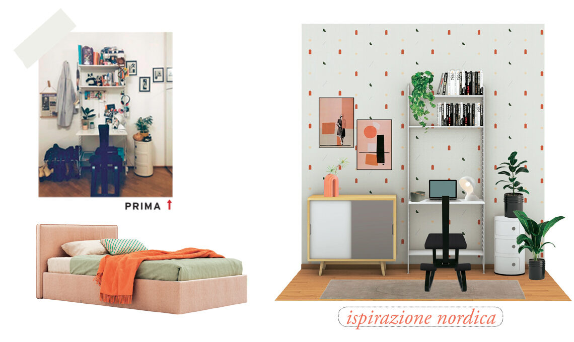 Mantenendo i 3 elementi imprescindibili (libreria con scrittoio, sedia ergonomica e mobiletto) la zona studio è stata completata con la credenza Fjord [Maisons du Monde] e una wallpaper [Coordonn] grafica con colori ripresi nelle stampe realizzate dalla blogger Picsilli! Porta-utensili [Hiro Design], vaso Handy [Kave Home], tappeto Bent Circle [Benuta]. Il letto è Arial a una piazza e mezza, imbottito e rivestito in tessuto, disponibile con o senza box sottorete [Nidi].