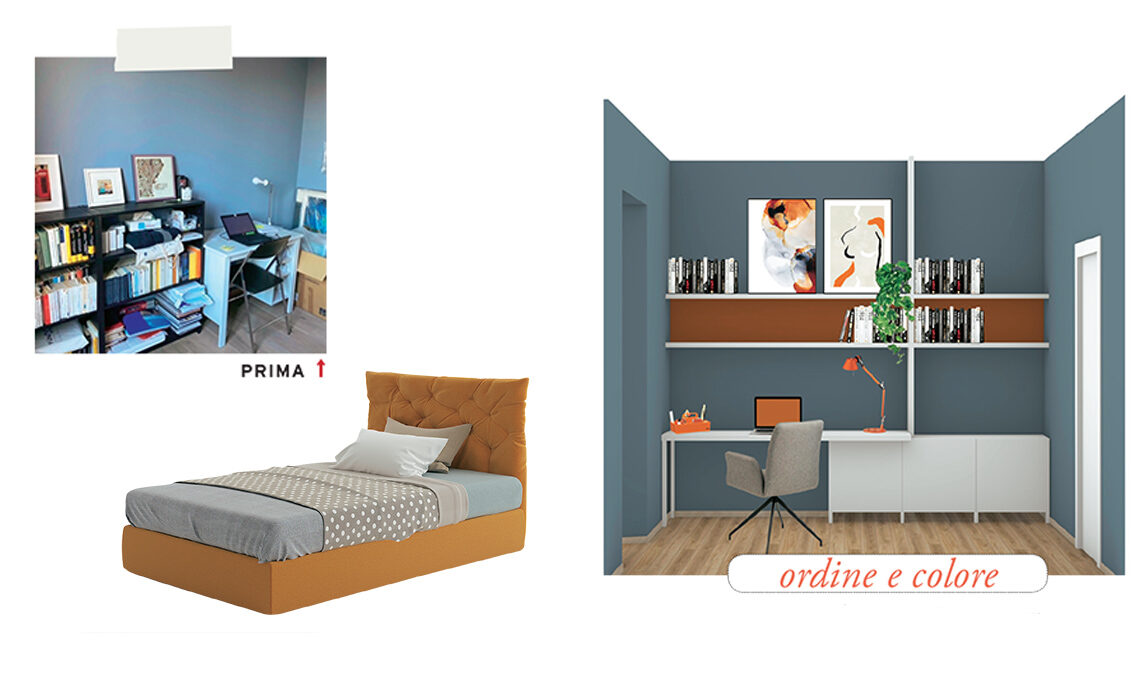 Una composizione semplice, funzionale e d’effetto con mobili chiusi Besta che fanno da supporto al piano Linnom da cm 120 (quello di prima era piccolo), con gambe Govin, tutto Ikea. Tra le mensole su misura una fascia arancio ravviva il grigio ed è ripresa dagli accessori. Sedia Naya [Westwing], lampada Tolomeo micro [Artemide], poster [Desenio]. Il letto è 9097 arancio, con contenitore e giroletto più testata capitonné sfoderabili [Giessegi].