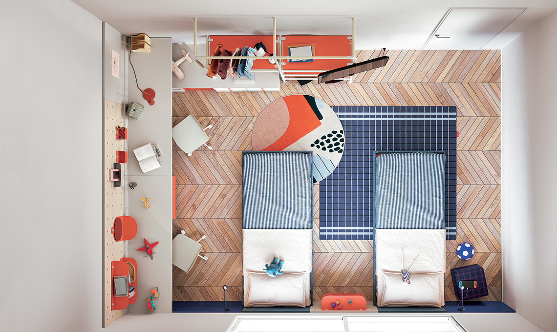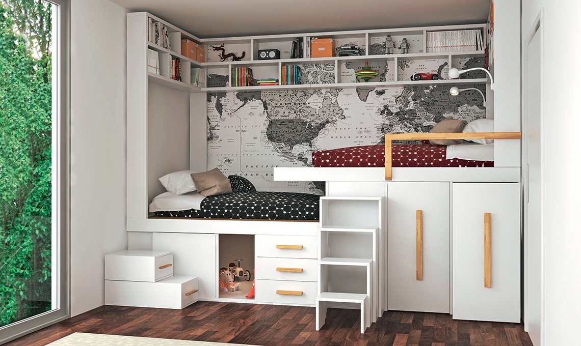 Quando si comincia ad andare a scuola servono soluzioni pratiche per trasformare la stanza di volta in volta: da zona studio a spazio per giocare e, perché no?, per dormire con gli amici. Il soppalco è una soluzione salvaspazio: di giorno, il pianale scorrevole va a coprire la scala-contenitore che porta al letto, liberando spazio in altezza.