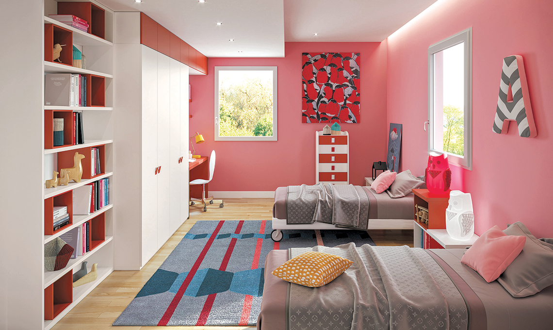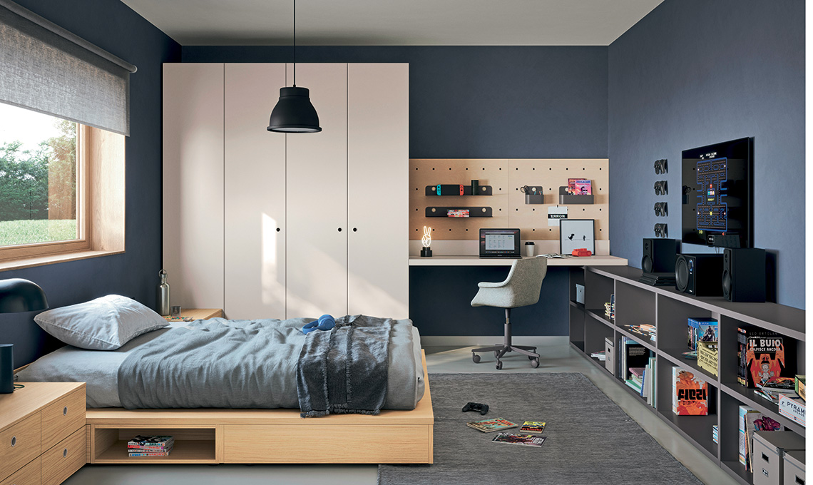 Nell’adolescenza si sogna una camera che dia spazio alle passioni ma anche allo studio, che si fa serio: perciò non devono mancare le librerie a contenitori che sfruttano ogni centimetro.