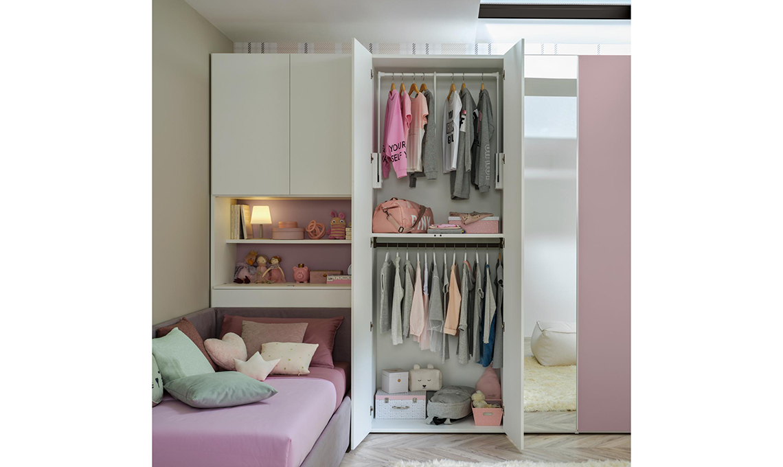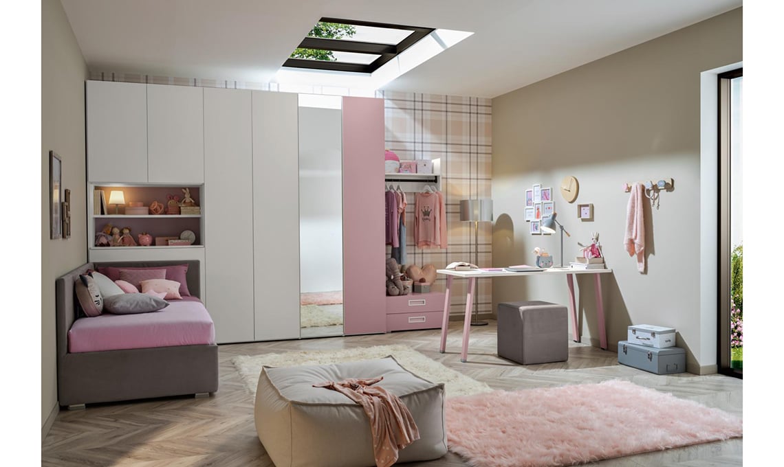 In questa fascia d’età, la camera deve lasciare spazio ai giochi e al movimento ed essere dotata di mobili multifunzione da utilizzare in totale sicurezza. L’armadio deve essere abbastanza grande da accogliere non solo i vestiti e il cambio di stagione ma anche la biancheria da letto dei bambini e tutte le attrezzature per gli sport che praticano. Per la loro sicurezza, scegli ante e cassetti con cerniere e guide a chiusura rallentata. Il letto con box contenitore o seconda rete estraibile: meglio se imbottito (con rivestimento asportabile e lavabile in lavatrice) e con i profili smussati. Il materasso ideale è anallergico, alto almeno 18 cm, in schiuma (per resistere soprattutto alle sollecitazioni diurne) e da proteggere con un coprimaterasso impermeabile traspirante. La scrivania serve dai 6 anni: sceglila con piano resistente e lavabile e con gli angoli smussati, per evitare incidenti durante le ore di gioco in camera.