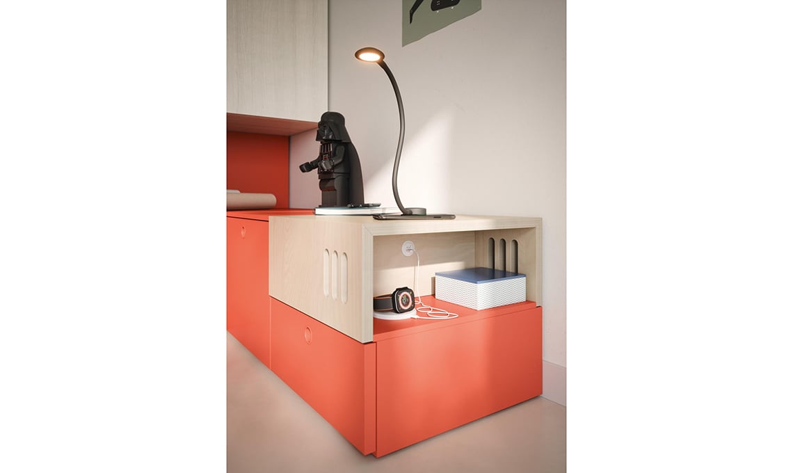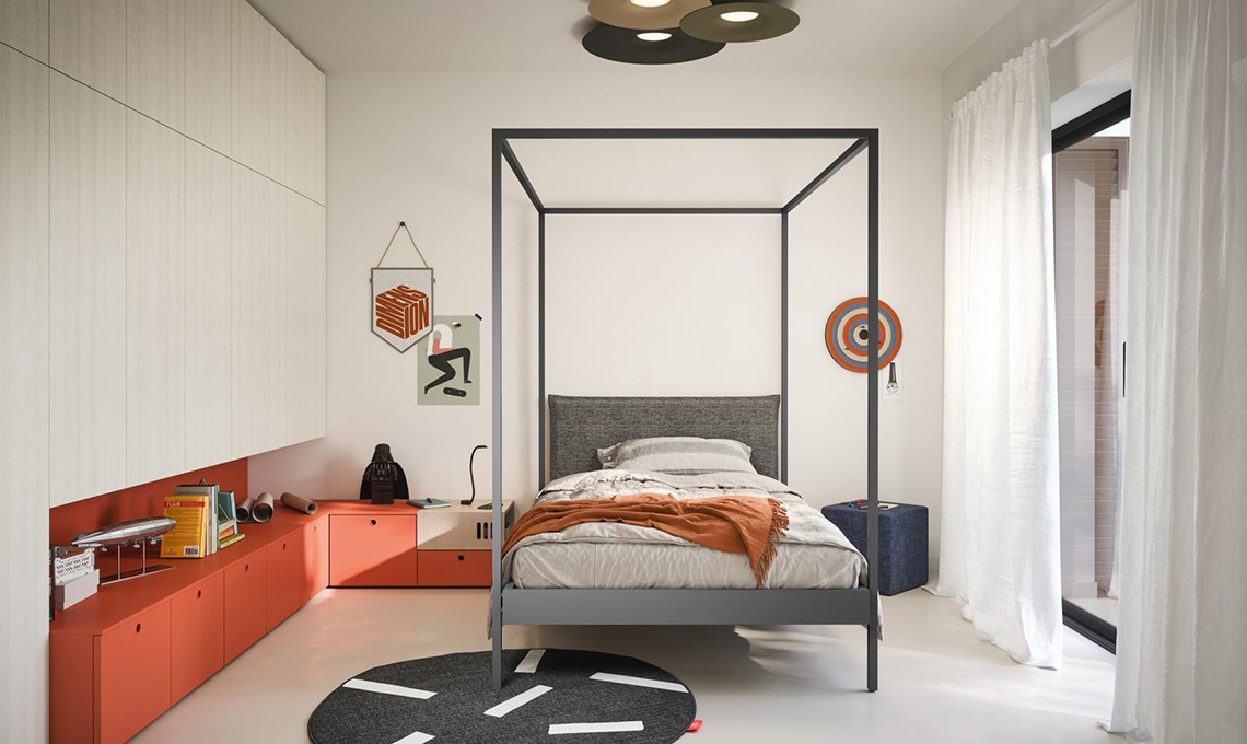 Space 23 collezione Kids 2023 di [Nidi] con letto a baldacchino Kap [cm 136,6x209x200h], armadio battente Olmo con base laccato Papaya [cm 360x41/60x330h], modulo Jack con doppia presa USB e ricarica wireless [cm 45x45,4x19,5h].